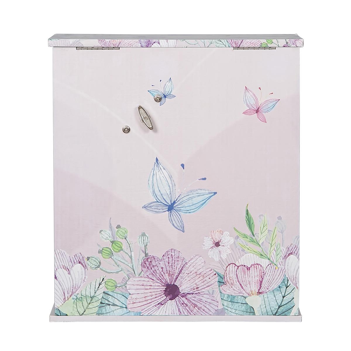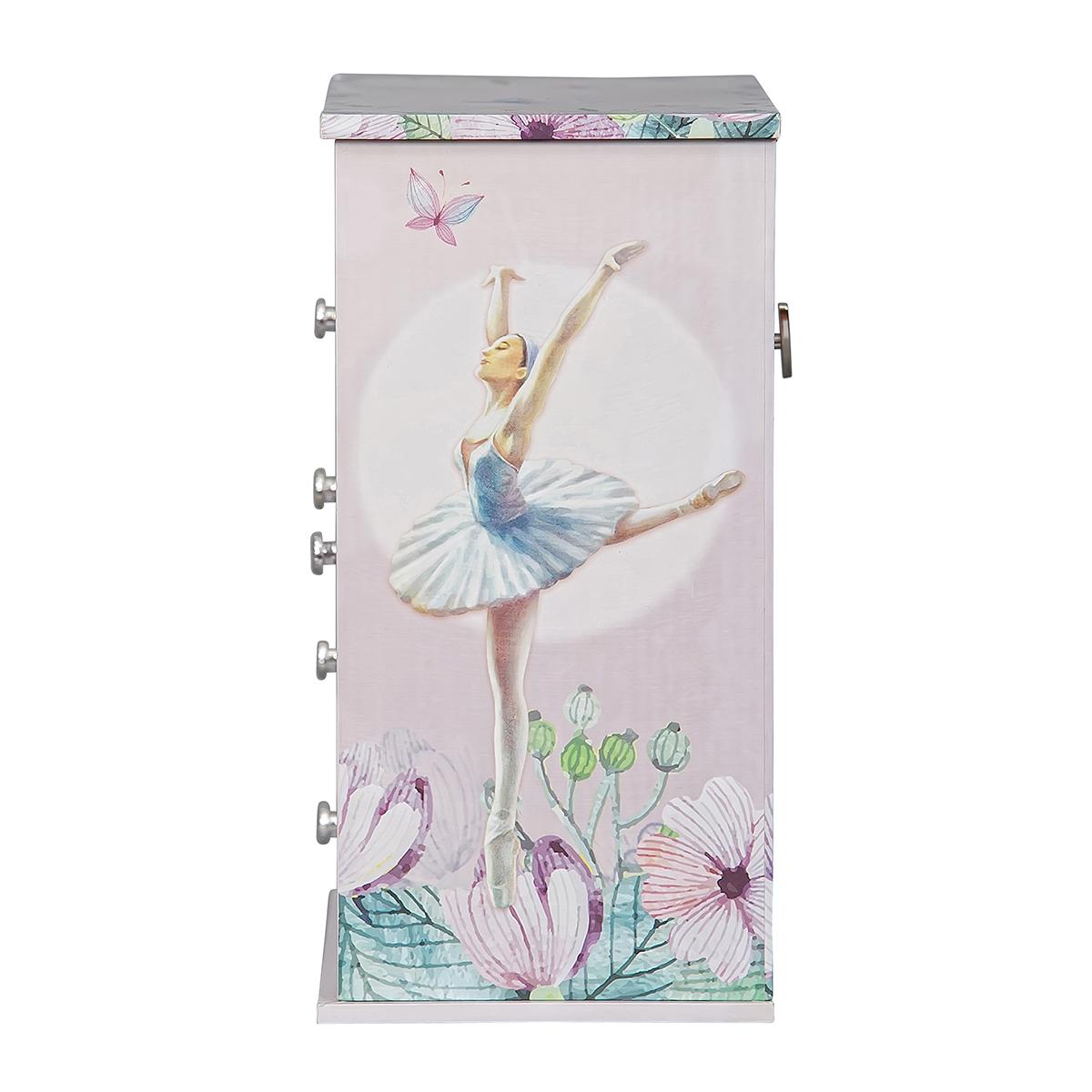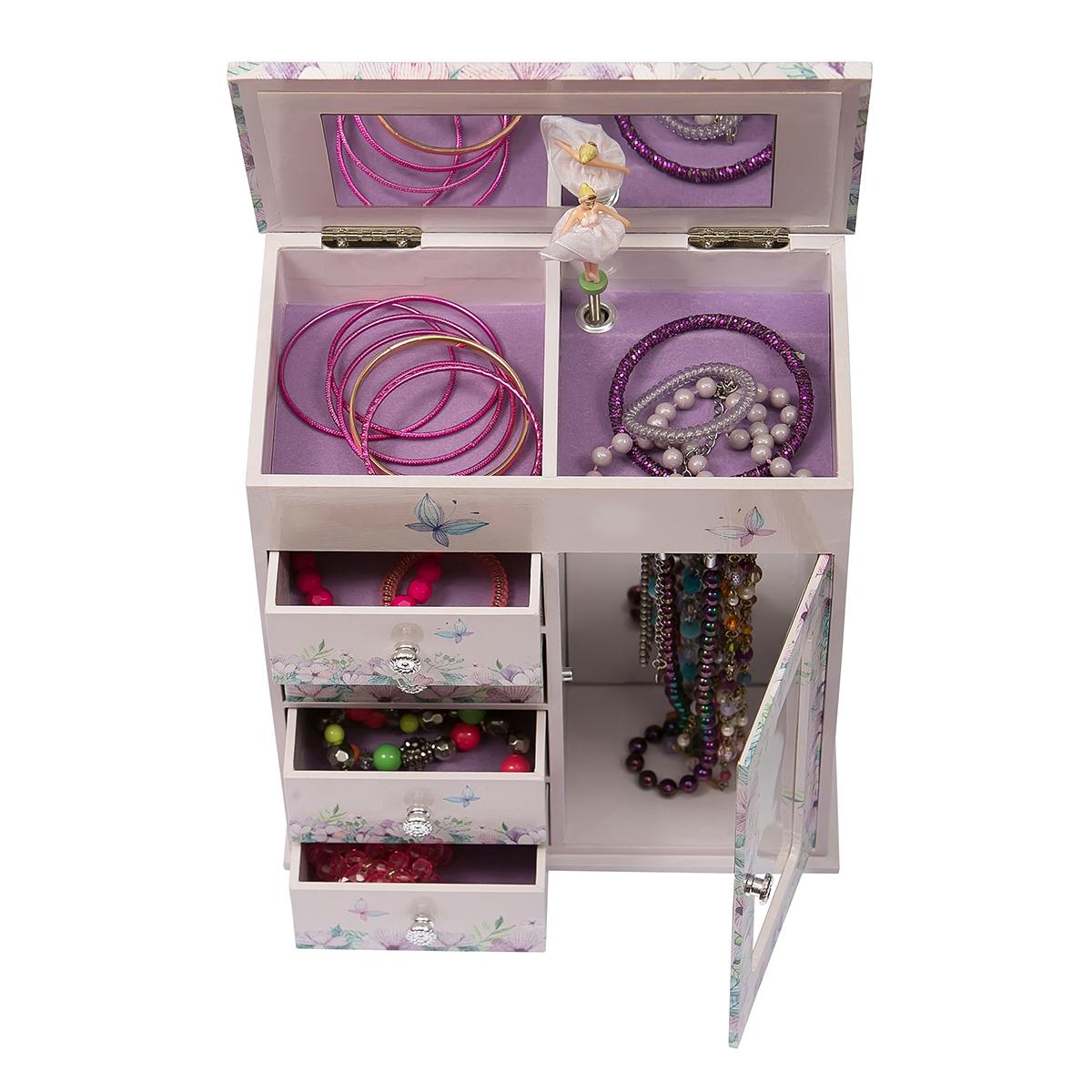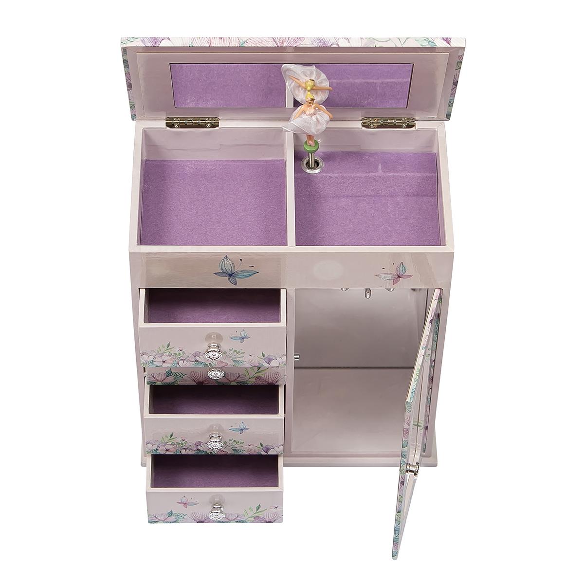 Sweetly feminine, the Mele & Co. Liliana girl´s musical ballerina jewelry box is a splendid setting for all her treasured trinkets! Featuring a lift lid with interior mirror and magnetic closure, the top compartment offers two sections, and hand lined in lilac suede fabric with butterflies and flowers fashion paper overlay. A necklace carousel, four drawers, and twirling ballerina promise plenty of storage for your own prima ballerina.