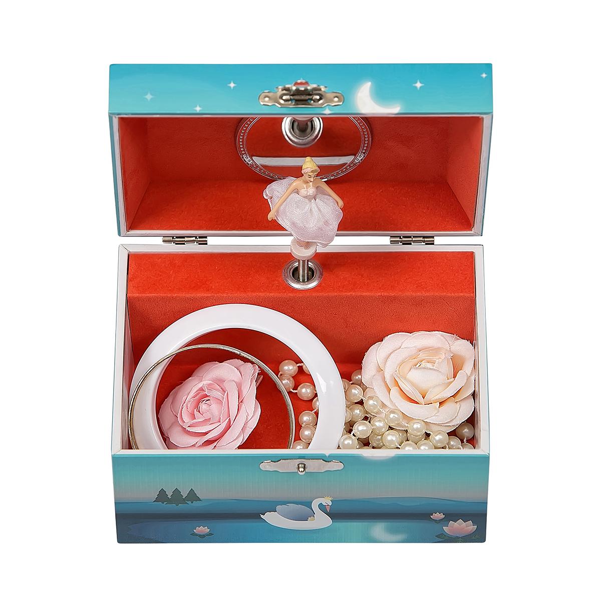 Fun and fanciful, the Mele & Co. Marlo girl´s musical ballerina jewelry box will enchant and delight young and old alike. Featuring a lift lid with oval interior mirror, the single compartment offers open area storage, and it is hand lined in coral suede fabric. With a twirling ballerina and ´Swan Lake´ ballet design, this jewelry box is every little girl´s dream.