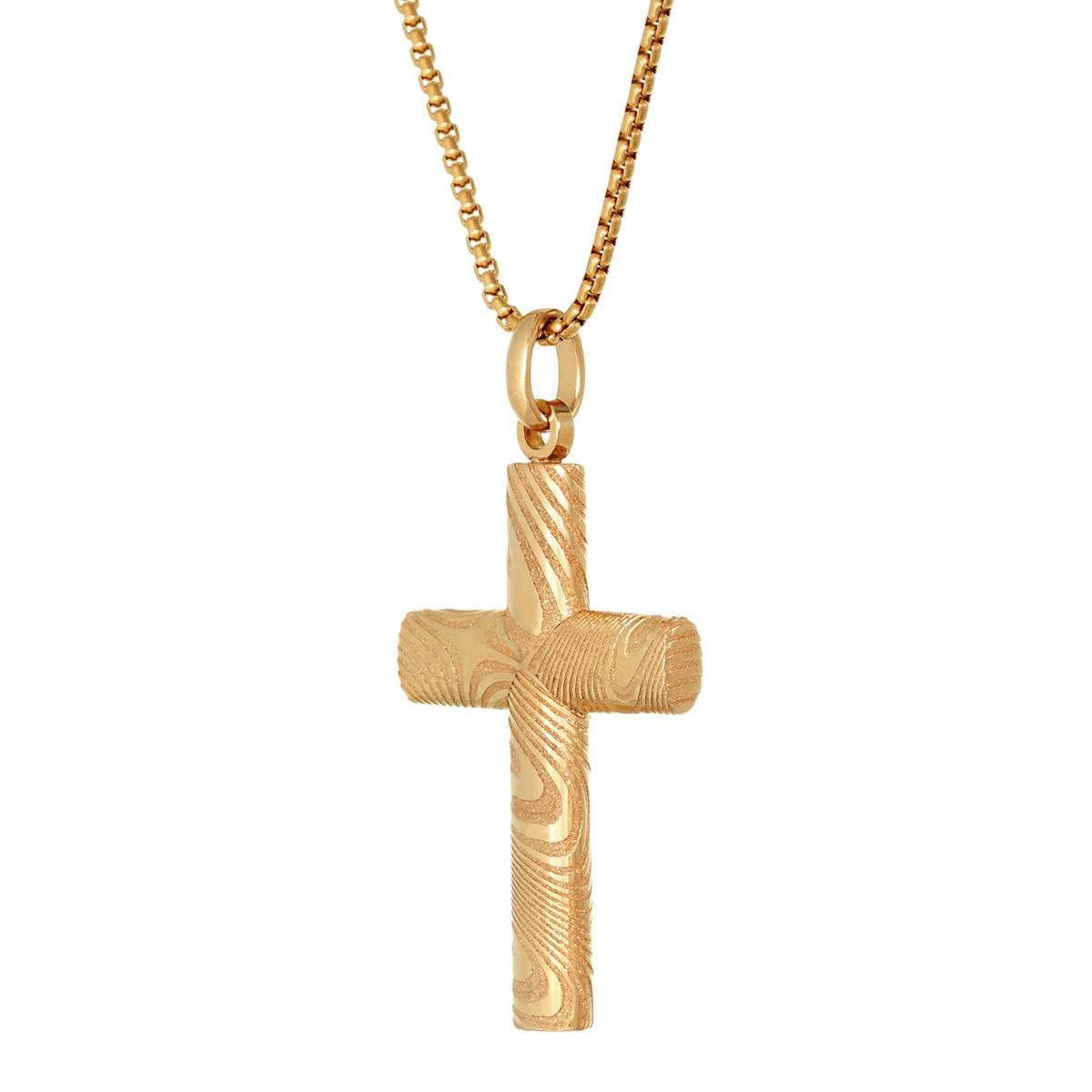 Mens Lynx damascus steel cross pendant with gold-tone ion plating on 24 inch gold-tone ion plating round box chain.