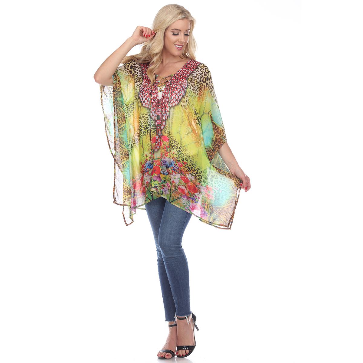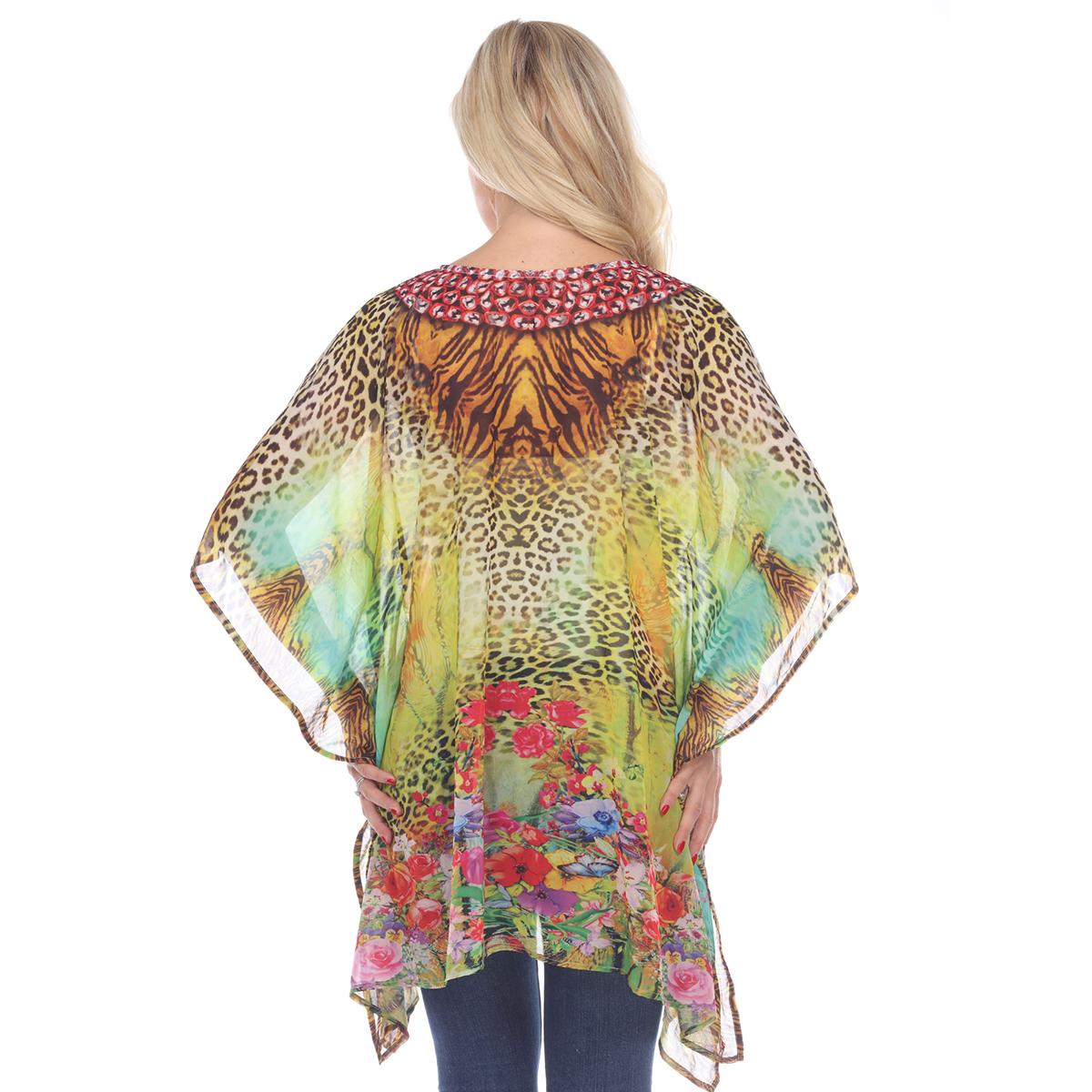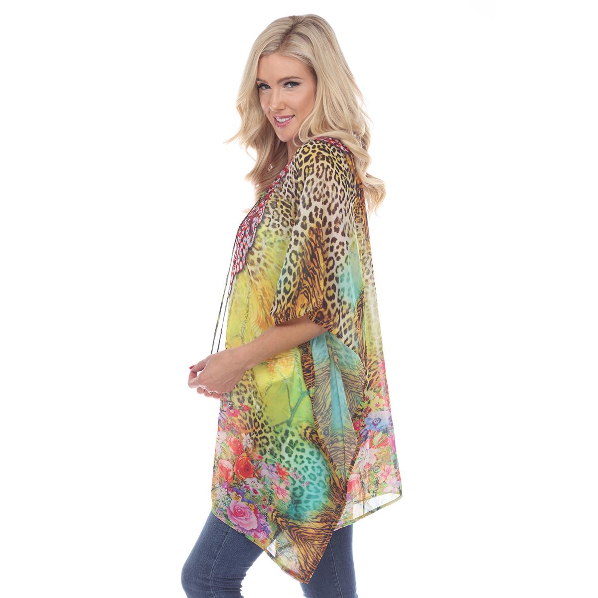 Add some fun to your style with this Womens White Mark yellow leopard print poncho. This rich print is sprinkled with sparkle, trims the criss-cross neckline of this flowing tunic perfectly accenting the sheer fabric.