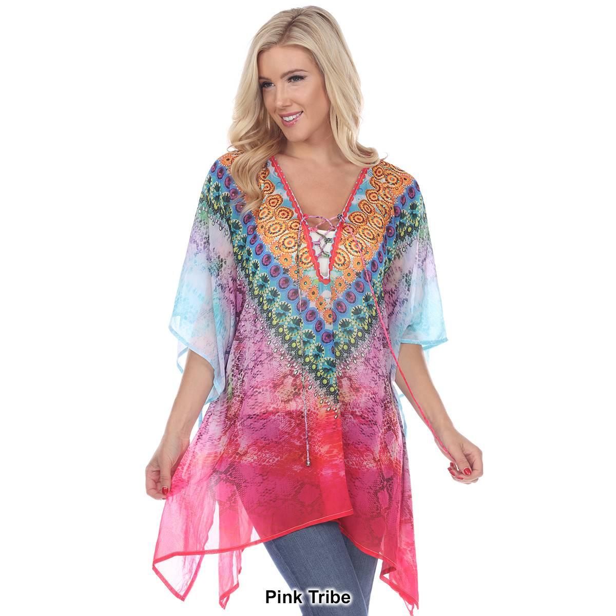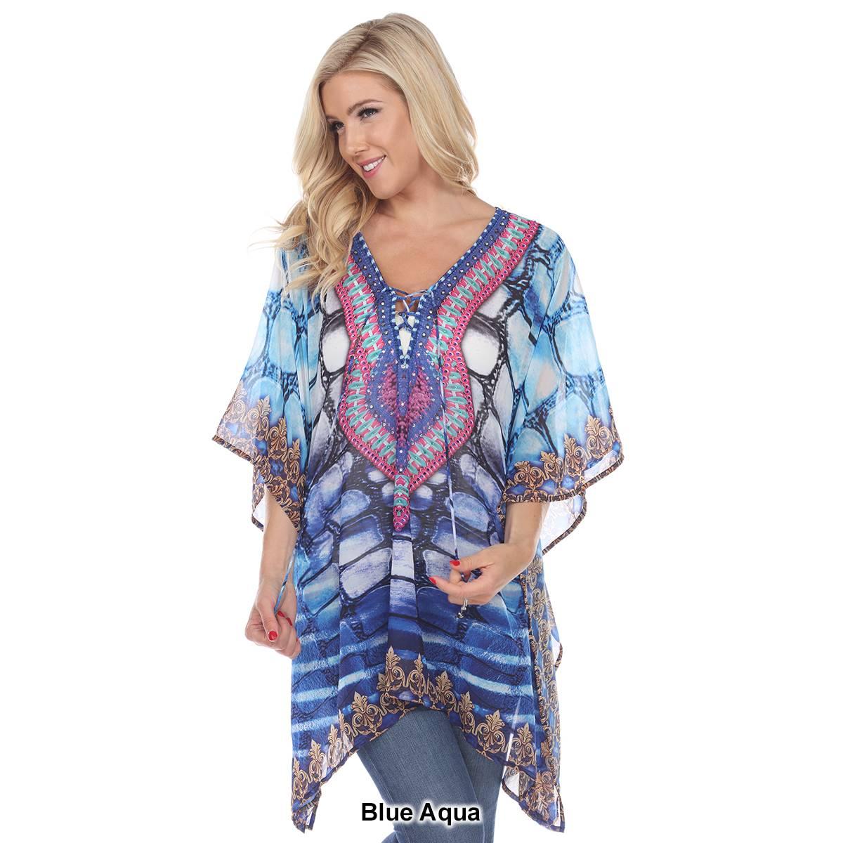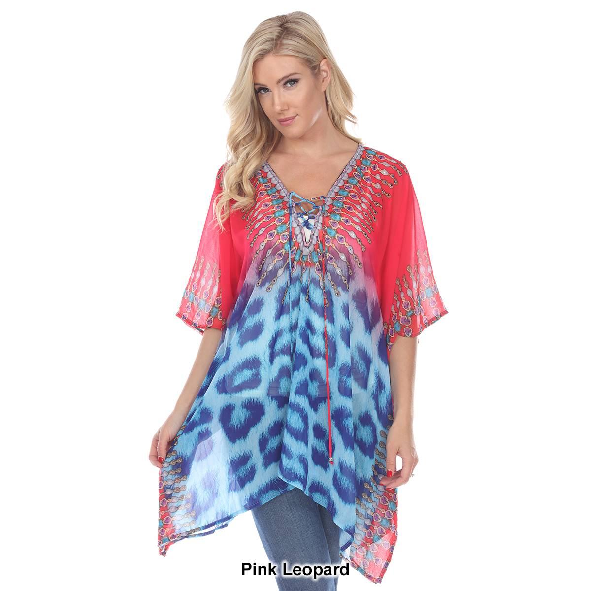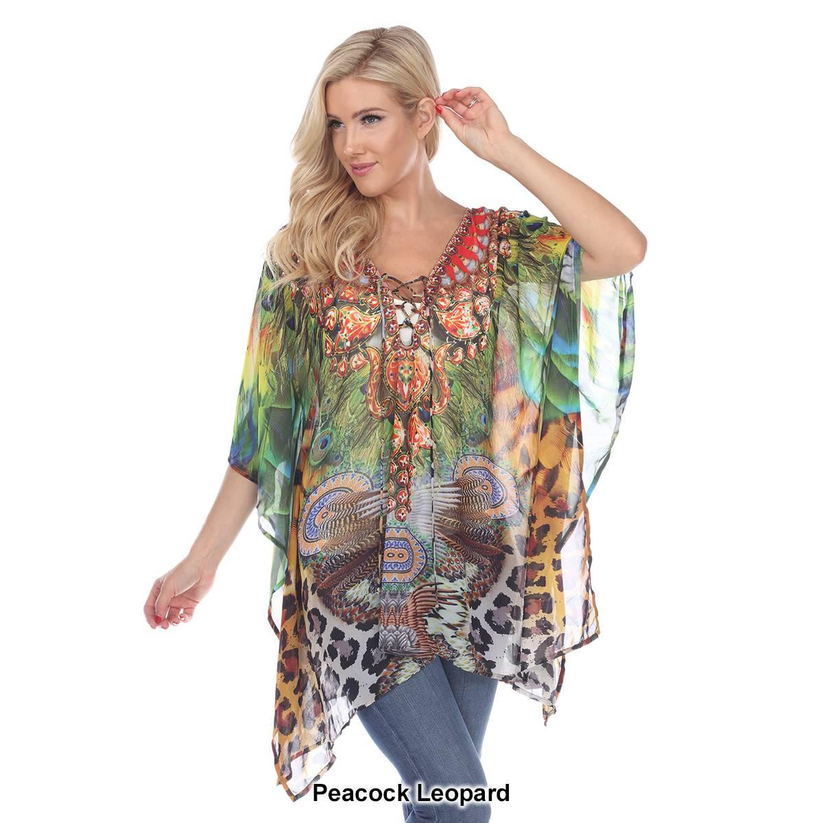 Add some fun to your style with this Womens White Mark yellow leopard print poncho. This rich print is sprinkled with sparkle, trims the criss-cross neckline of this flowing tunic perfectly accenting the sheer fabric.