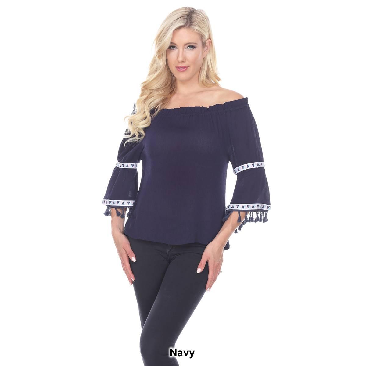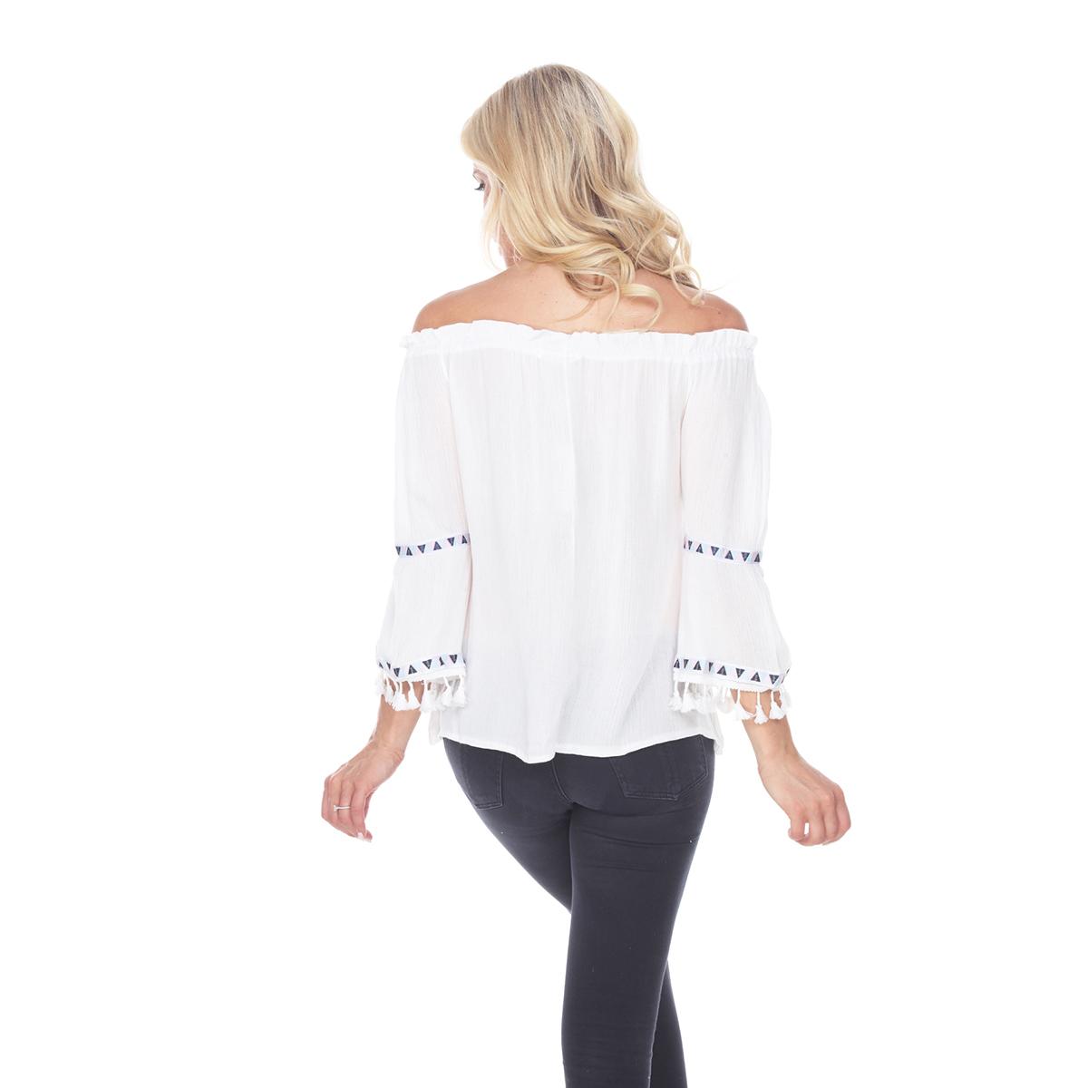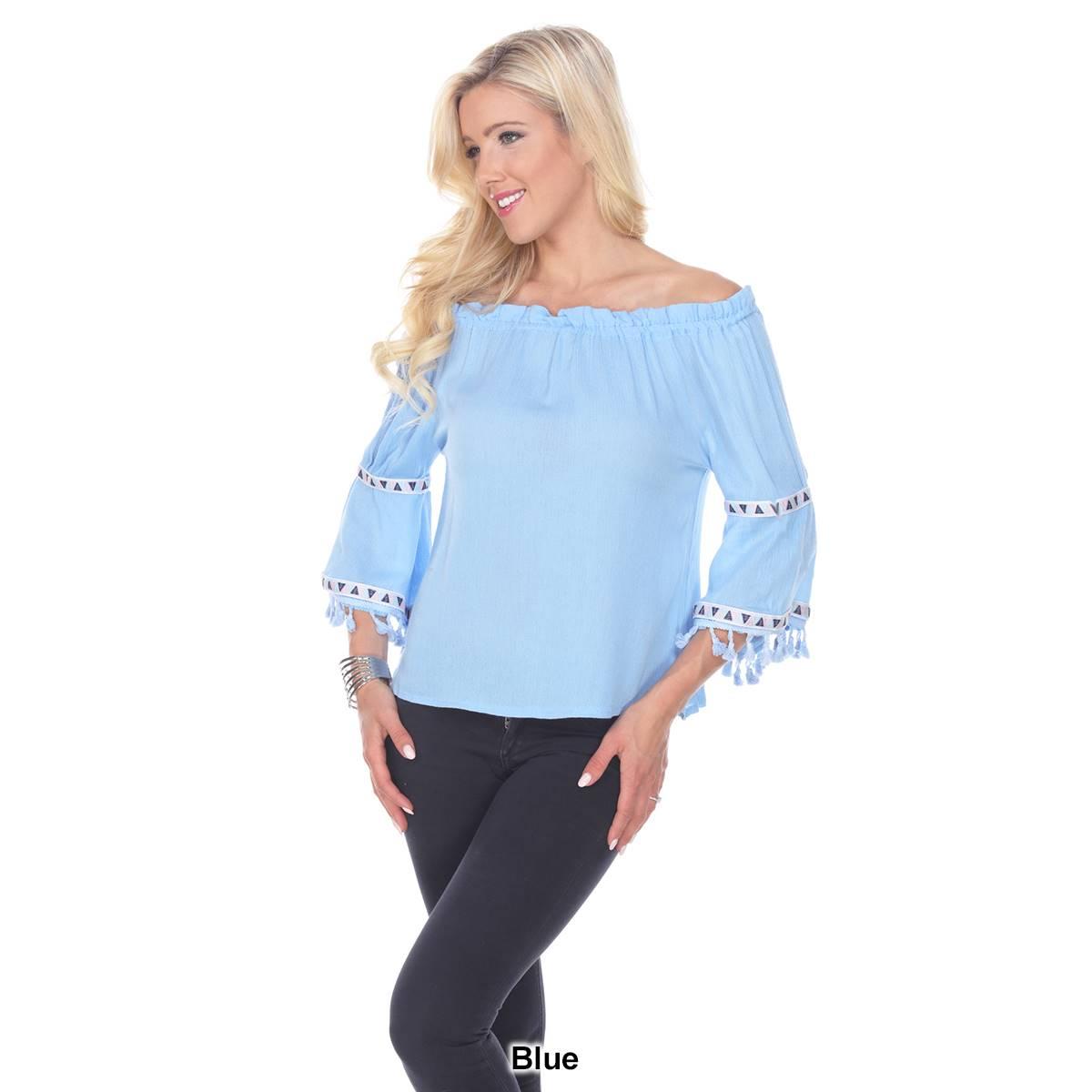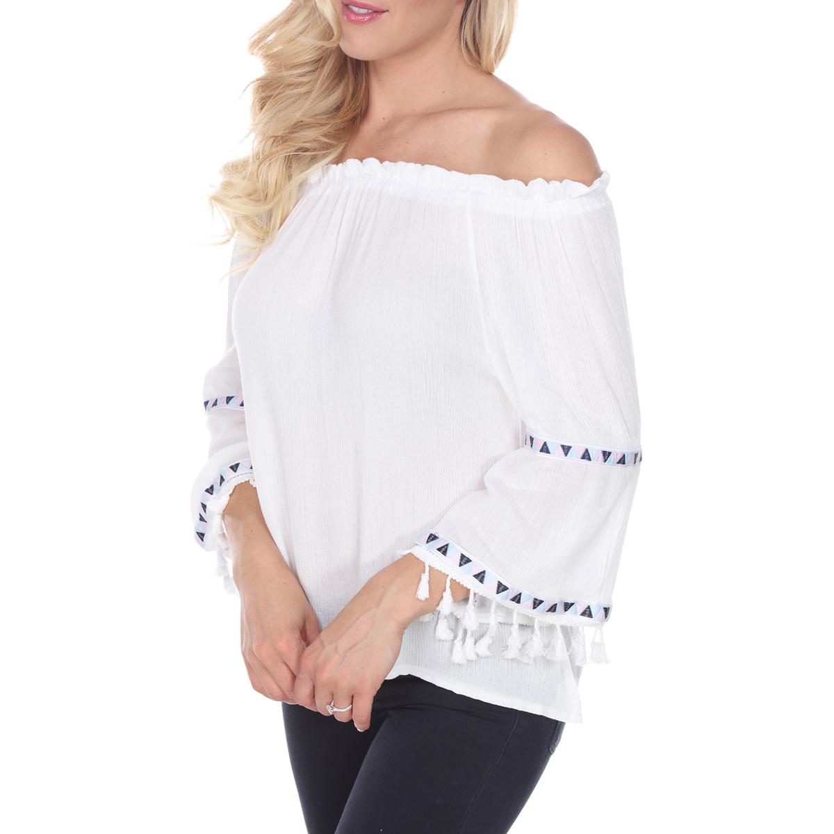 Add a touch of style and chic to your wardrobe with this Womens White Mark smocked neckline peasant top with pom pom trim. This oversized silhouette features bell sleeves and a smocked off-on shoulder neckline.