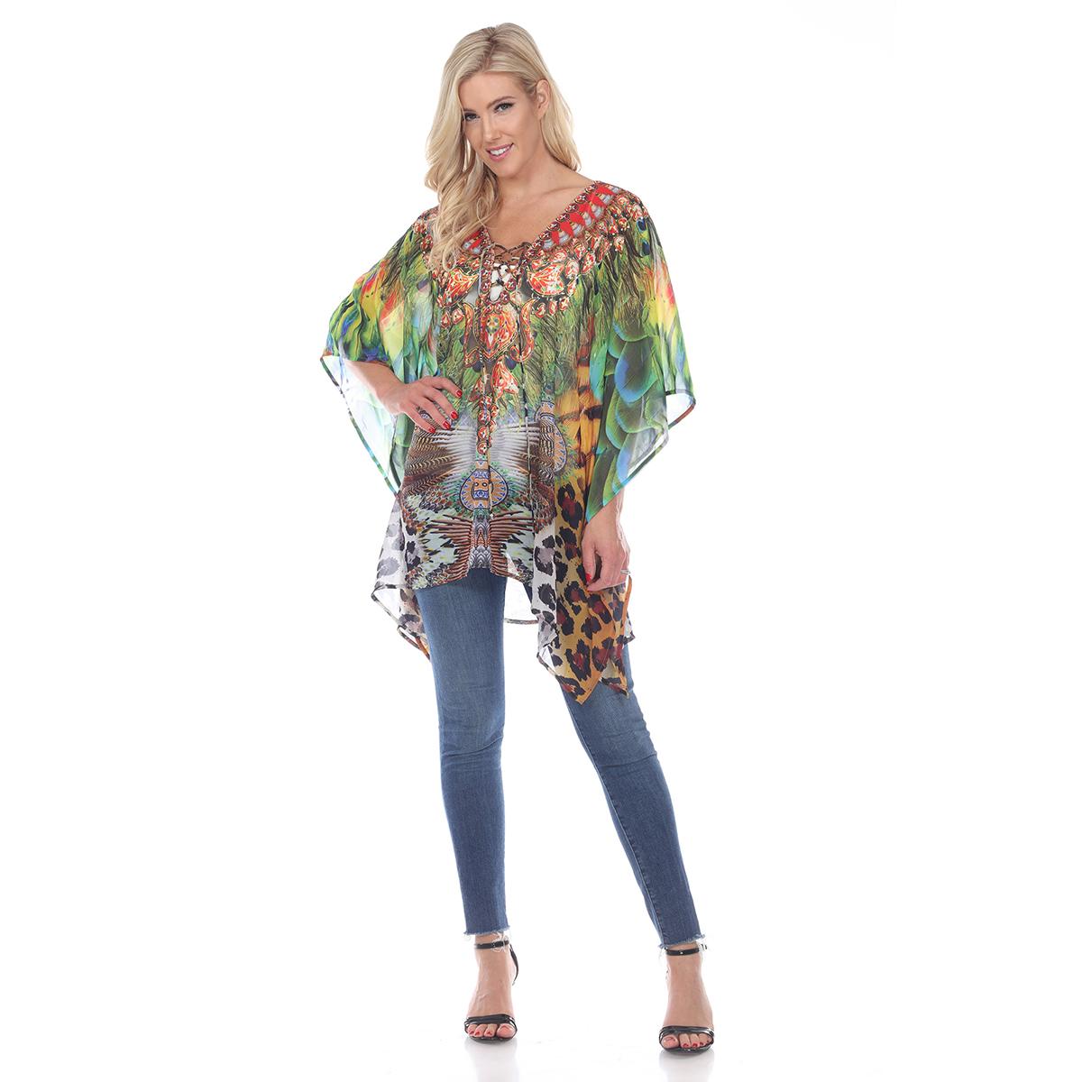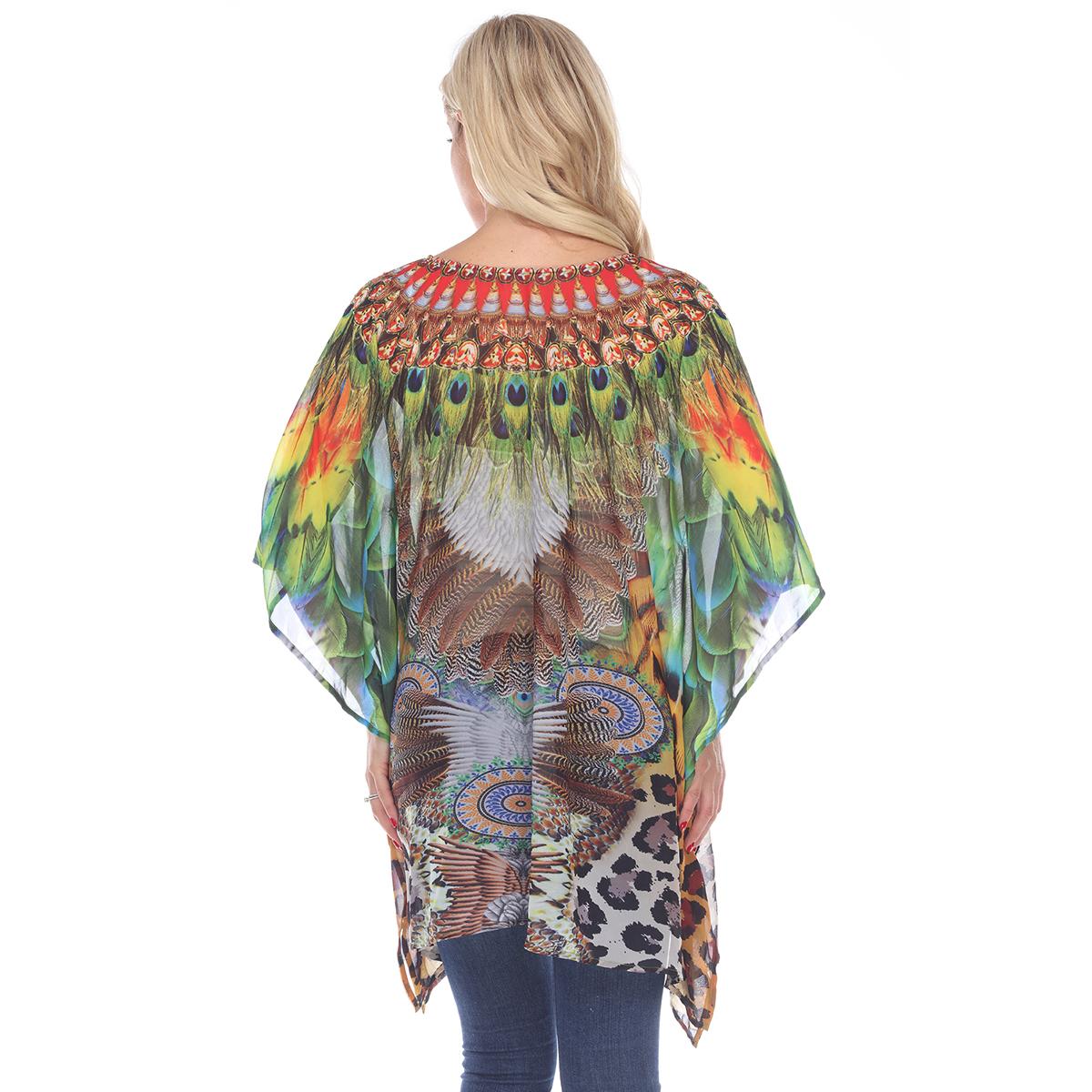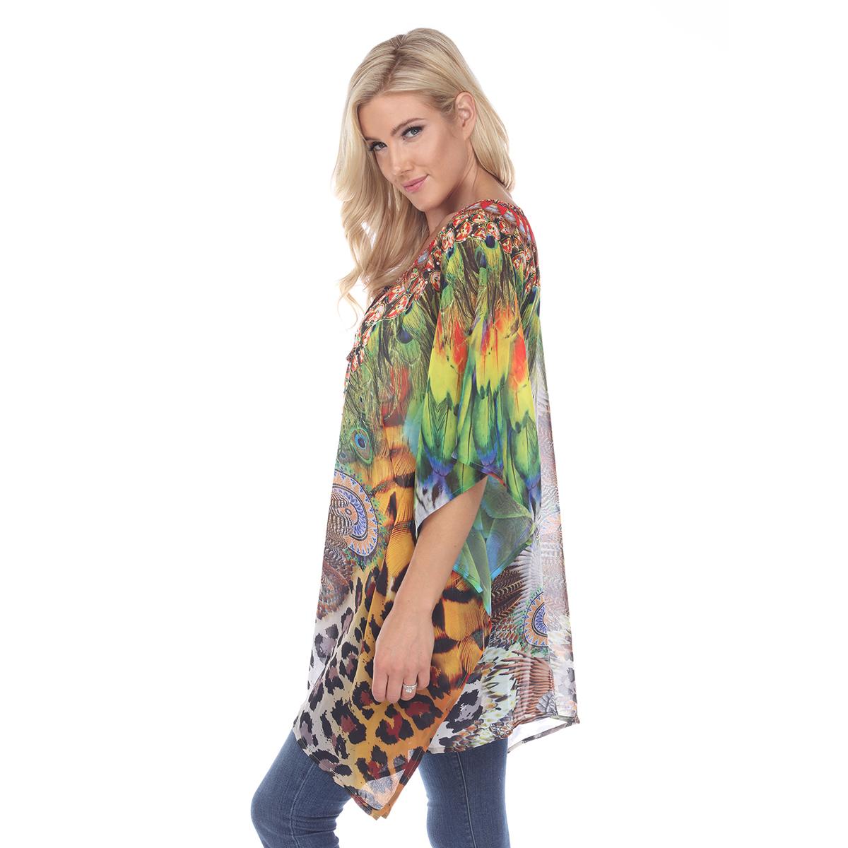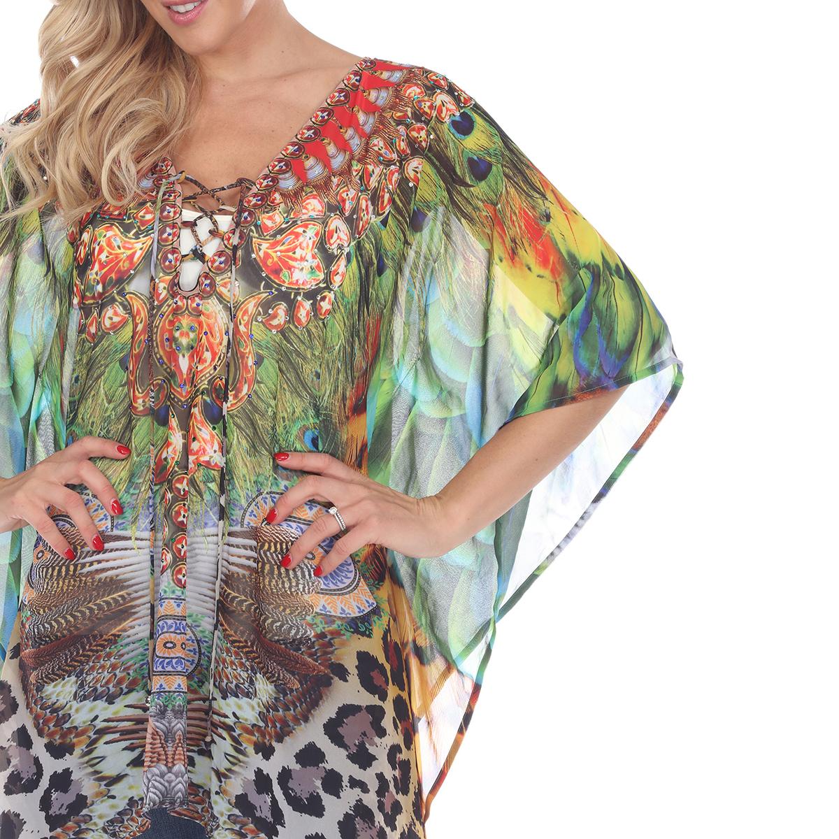 Add some fun to your style with this Womens White Mark peacock leopard caftan. This rich print is sprinkled with sparkle, trims the criss-cross v neckline of this flowing tunic perfectly accenting the sheer fabric.