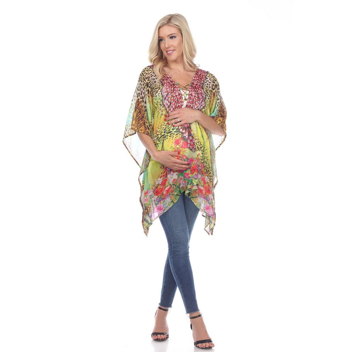 Feel confident and stylish in this Womens White Mark yellow print maternity caftan. A rich print sprinkled with sparkle trim and the criss-cross neckline of this flowing top perfectly accents the sheer fabric.