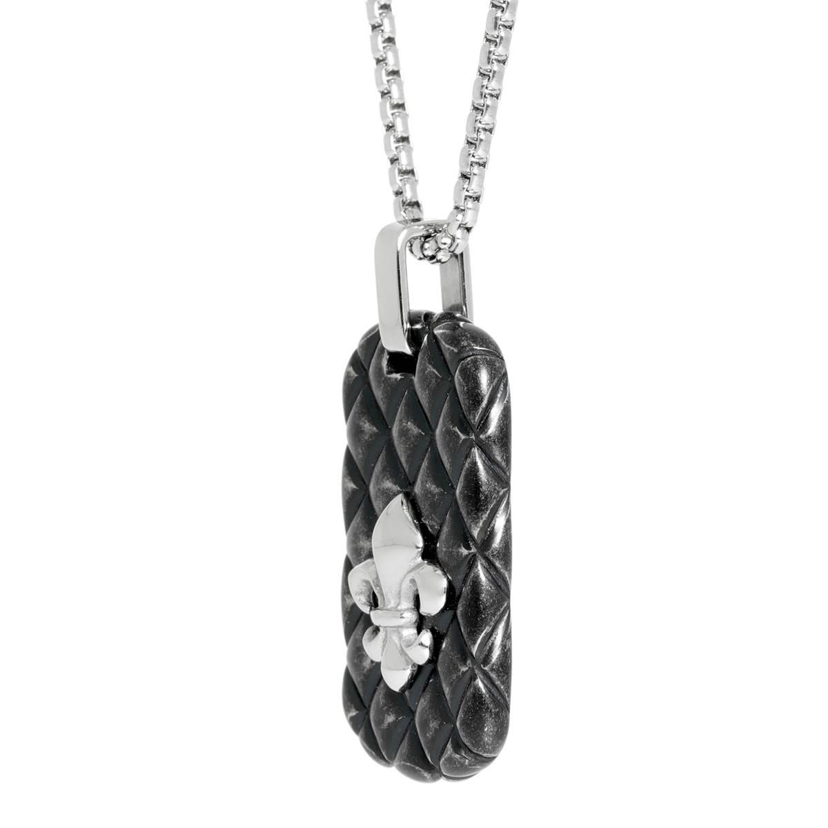Mens Lynx stainless steel fleur-de-lis dog tag pendant with black ion-plating on a box chain.
