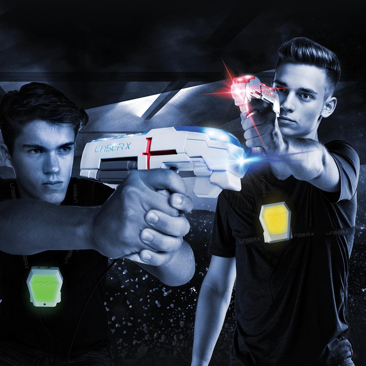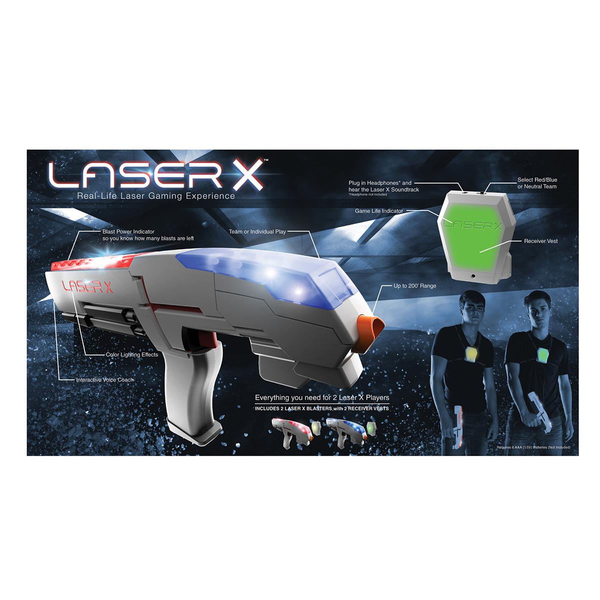 Description Use the NSI Laser X Double Set for a real-life laser gaming experience! Play as a team or as individuals. An interactive voice coach will give you tips and feedback...
