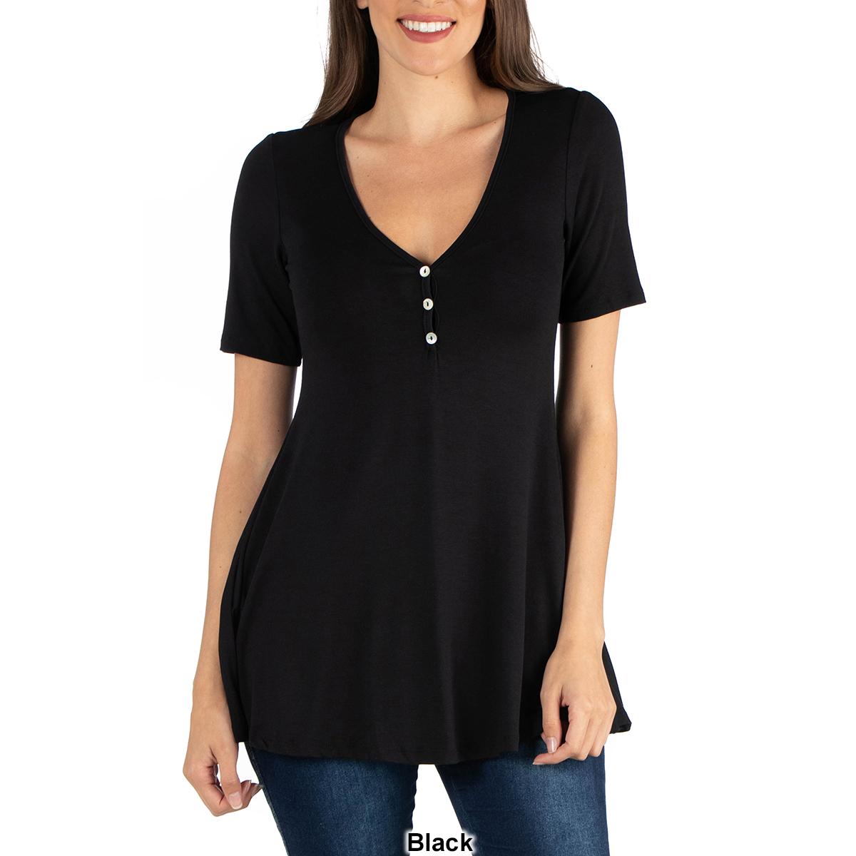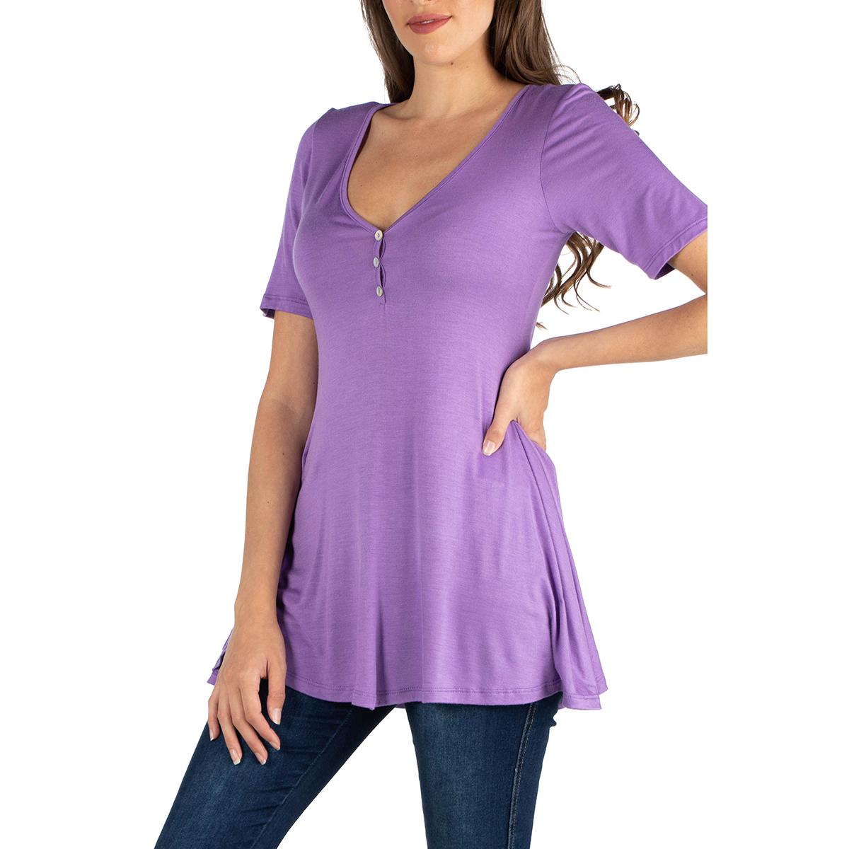 This versatile Womens 24/7 Comfort Apparel Henley top is perfect for dressing up or down for any occasion. With a delicate v neck, button detailing, slim fit waist, and flared hemline makes this top a mix of fashion and practicality. Perfect to wear by itself during the warmer months or to layer with in the colder months.
