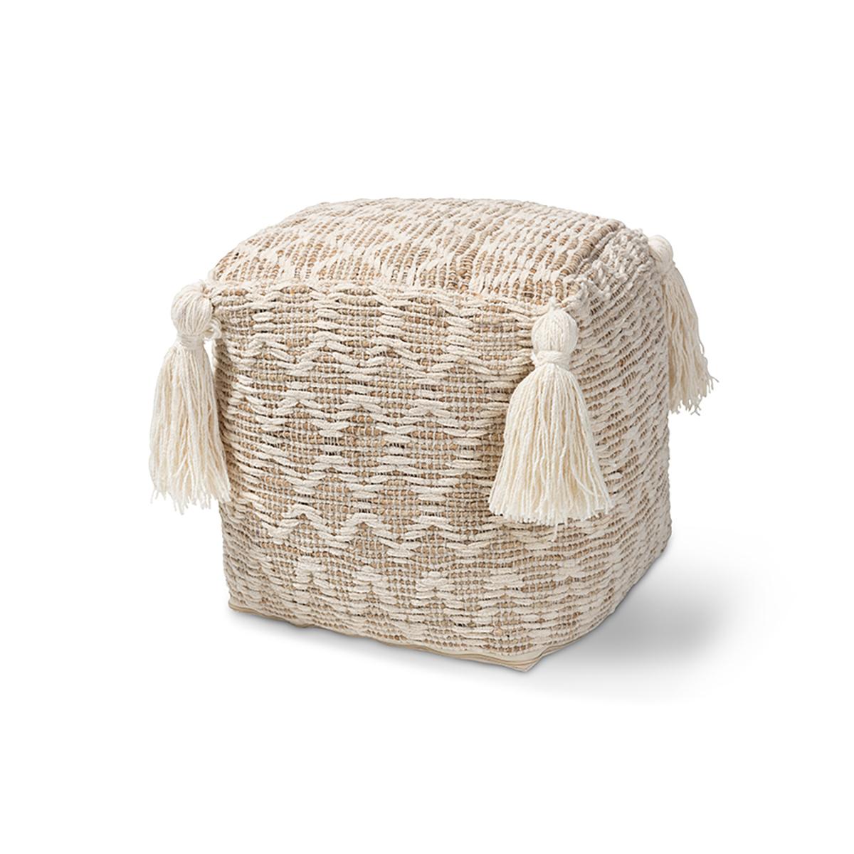 Add a cozy, bohemian touch to any space with the Baxton Studio Noland pouf ottoman. Handwoven from cotton, wool, and hemp, the Baxton Studio Noland pouf features natural and ivory tones spun into a lovely diamond pattern. Large tassels on the corners of the pouf lend a playful feel. This versatile piece can be used as a footstool, extra seat, or casual coffee table. Made in India.