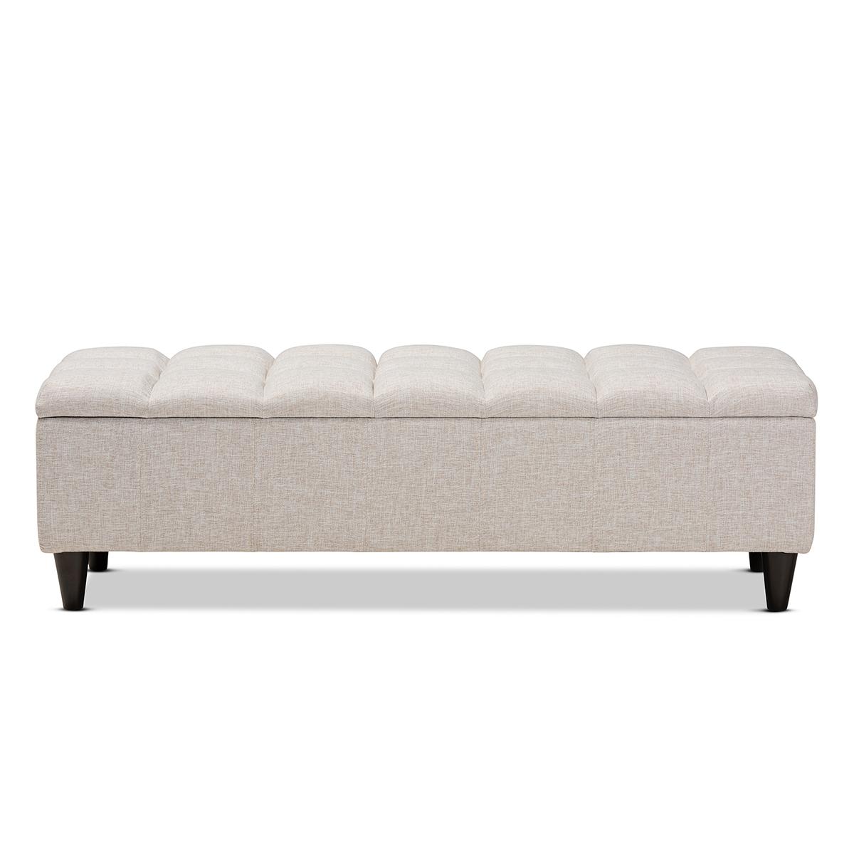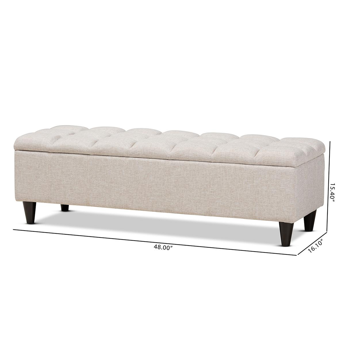 Add style and utility to any space with the Baxton Studio Brette storage ottoman. This chic ottoman features a streamlined design that makes it easy to coordinate with a wide range of decor styles. Upholstered in a soft, durable polyester fabric, the lid is foam-padded and biscuit tufted to provide the utmost sitting comfort. The ottoman features a storage compartment under the lid, providing space to store extra blankets and pillows. Tapered, dark brown-finished wood legs add mid-century modern appeal. Use this versatile piece in the entryway, living room, or bedroom.