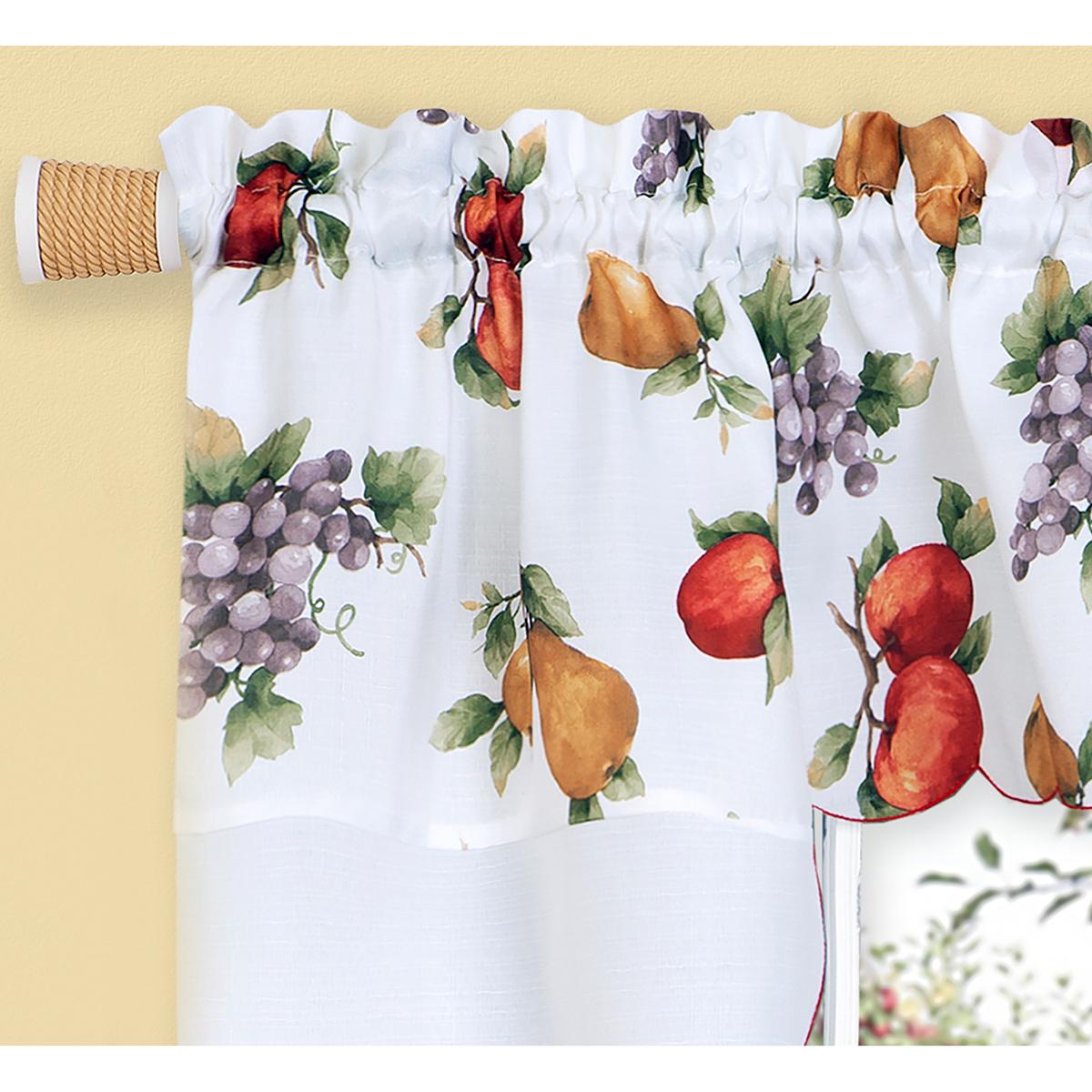 A bountiful assortment of apples, pears, and grapes are displayed throughout the Achim Ambrosia embellished kitchen curtain tier set. Realistically printed and embellished fruit will make you want to take a bite. The swag has embellished accents and scalloped edges.