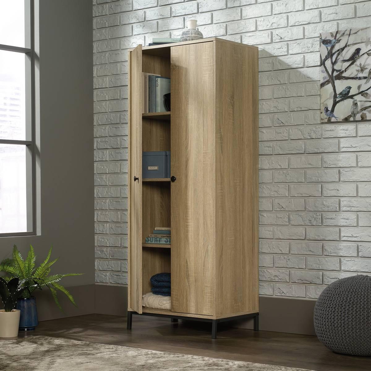 Create the storage options you need without having to sacrifice on style with this Sauder North Avenue Collection double door storage cabinet. Behind its large doors is a hidden storage area that includes three adjustable shelves that have the ability to move to different heights to create flexible storage for items of all shapes and sizes. Decorative accents of this 2 door storage cabinet include a durable, black metal base and a Charter Oak finish.