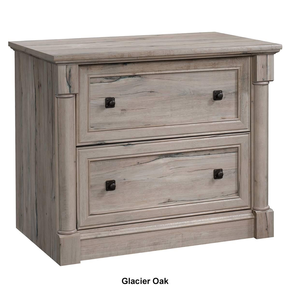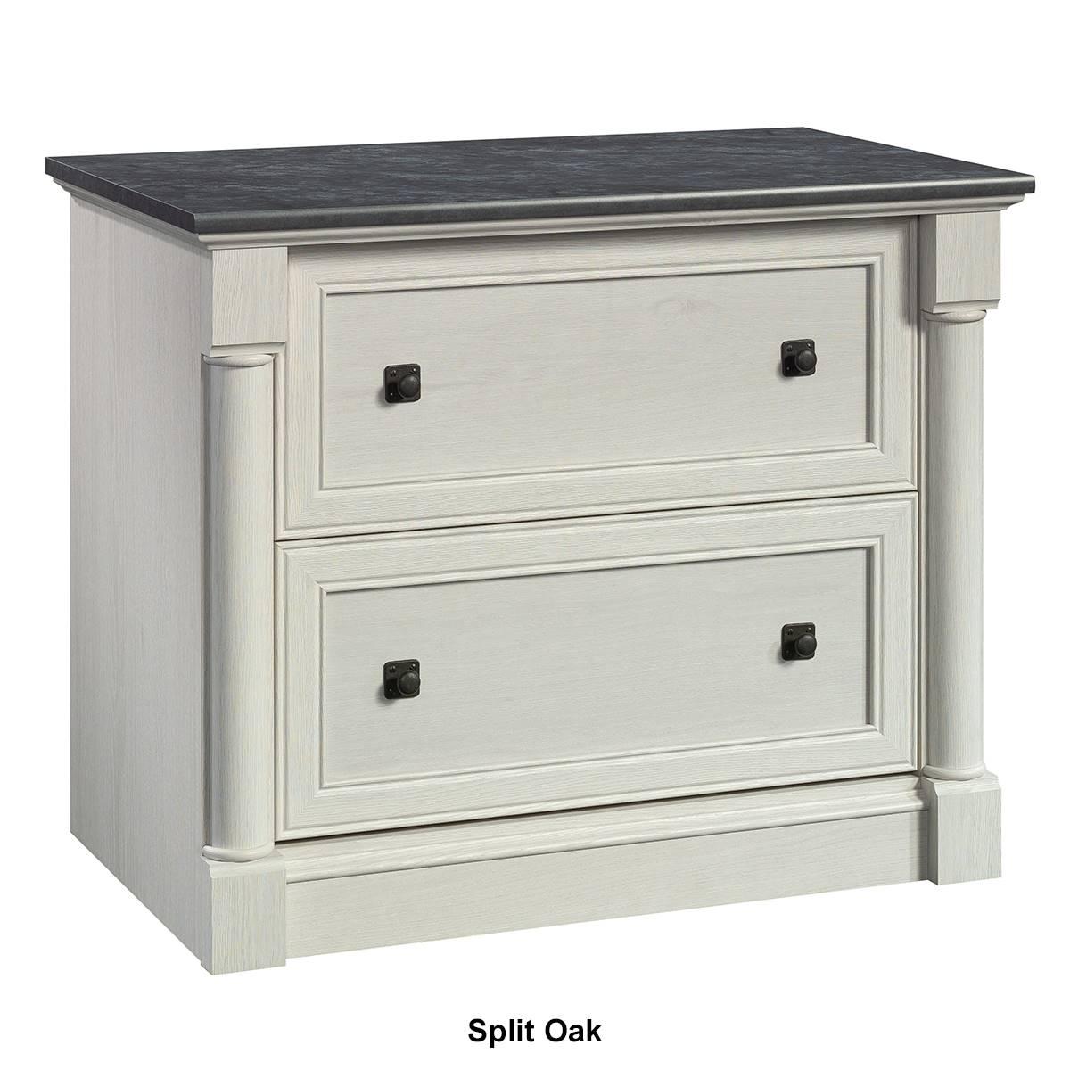Find a place for all your important documents without having to sacrifice on the style you love with this Sauder Palladia collection lateral file. This cabinet features two large drawers with full extension slides to hold letter, legal, or European size hanging files. It also features a patented, interlocking safety mechanism that allows only one drawer to open at a time for extra safety precautions. This wood lateral file cabinet offers a spacious top surface that provides you with space for office supplies and home décor items like a printer, decorative plants, or a lamp. Finished in Split Oak and detailed with attractive hardware, this stunning file cabinet will have you feeling organized in no time.