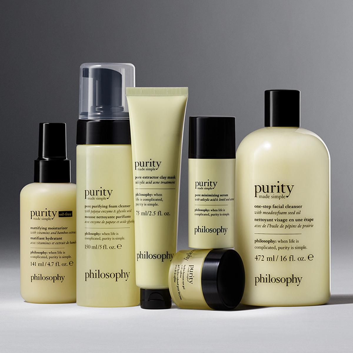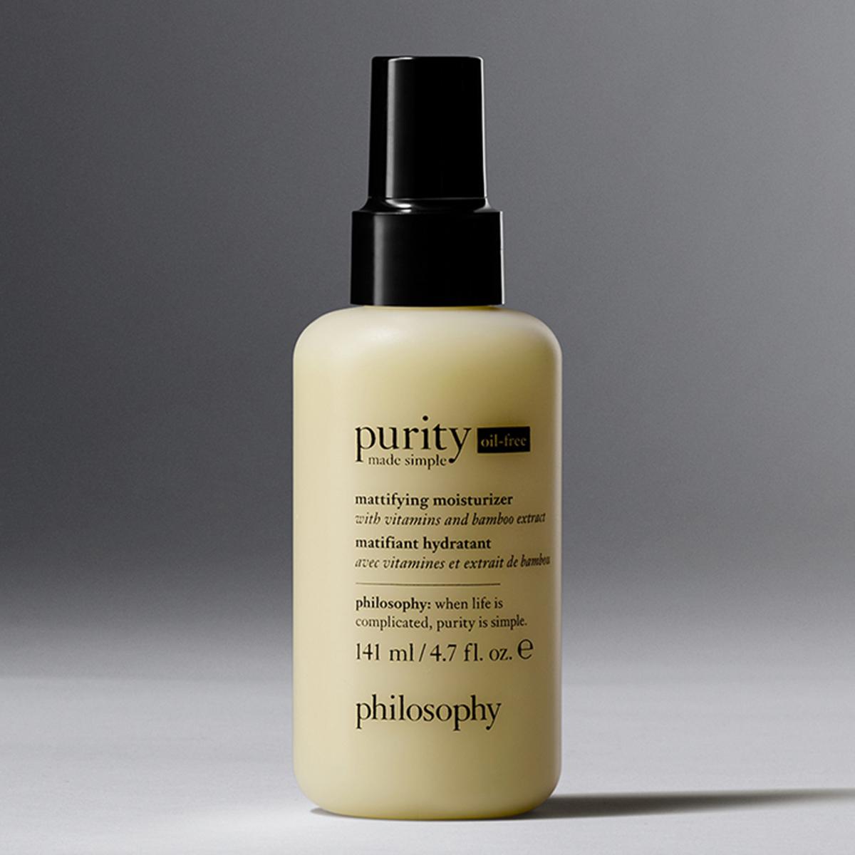 4.7 oz. Purity oil-free moisturizer matte skin made simple. experience all-day moisture without the shine. purity made simple® oil-free mattifying moisturizer features a quick-absorbing and velvety formula that delivers 24-hour hydration. formulated with bamboo extract, this oil-free mattifying moisturizer controls excess oil and shine. perfect for combination-to-oily skin types, skin is left with a healthy matte look all day with a less visible appearance of pores.