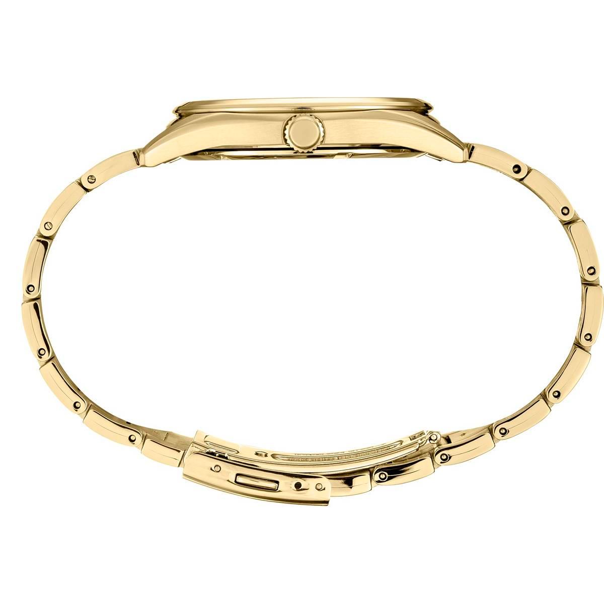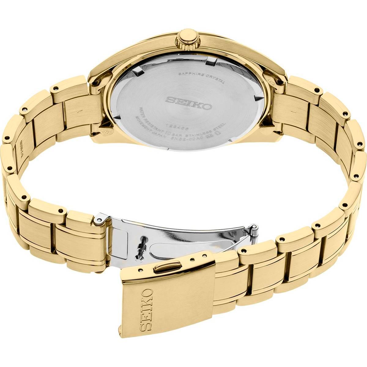 This mens Seiko Essentials gold stainless steel watch has a white dial with LumiBrite hands. Other features of this watch are date calendar, Sapphire crystal and stainless steel case and bracelet. It is water resistant up to 100 meters (330 feet).Band