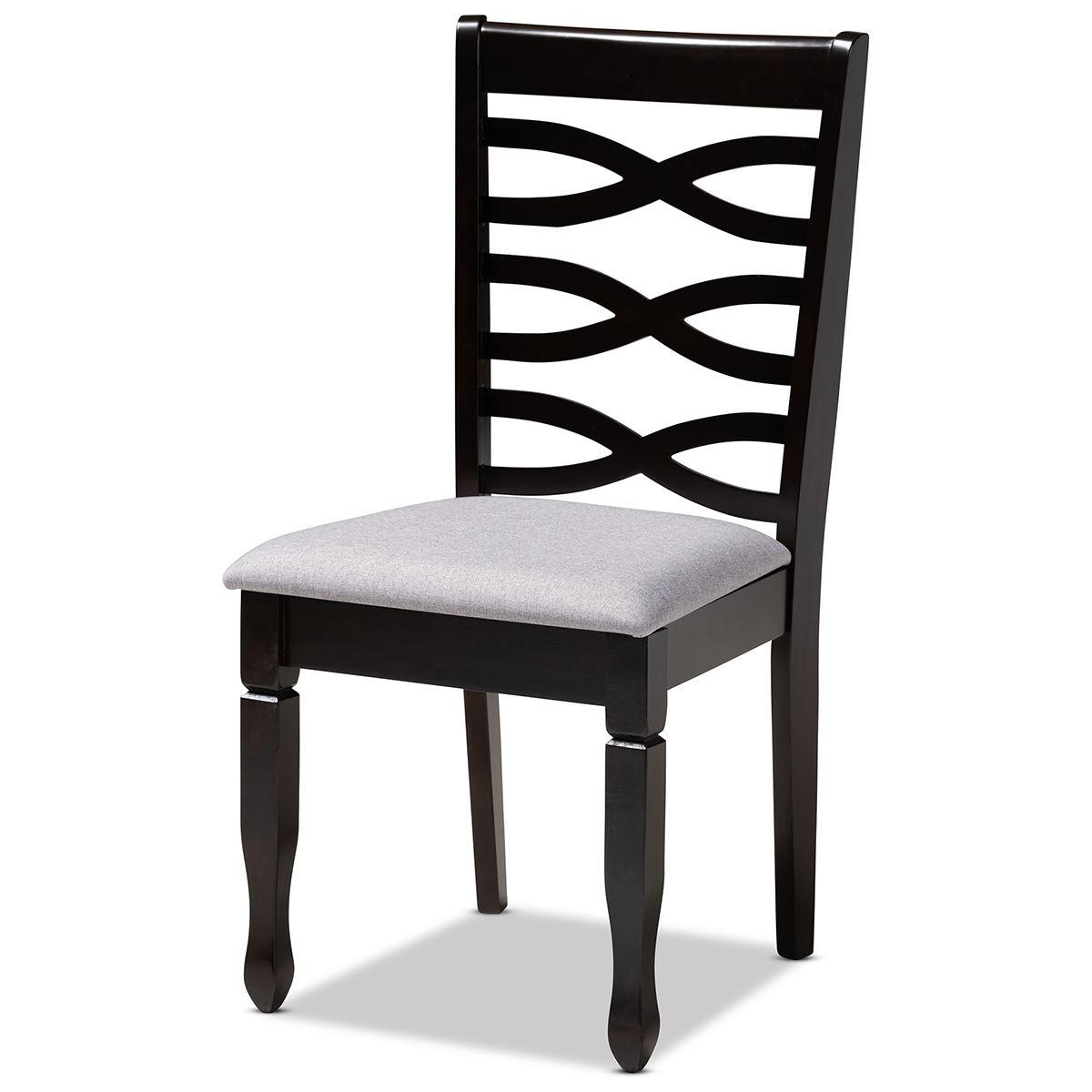 These Baxton Studio Lanier wood dining chairs come as a set of 4 and feature an exquisitely crafted frame and are a timeless addition to any dining space. The solid rubberwood chairs feature a sleek espresso brown finish that complements the light polyester fabric upholstery. Designed with both comfort and style in mind, they have plush foam-padded seats, as well as a striking cut-out design on their backs. The tapered feet add a classic, refined touch.