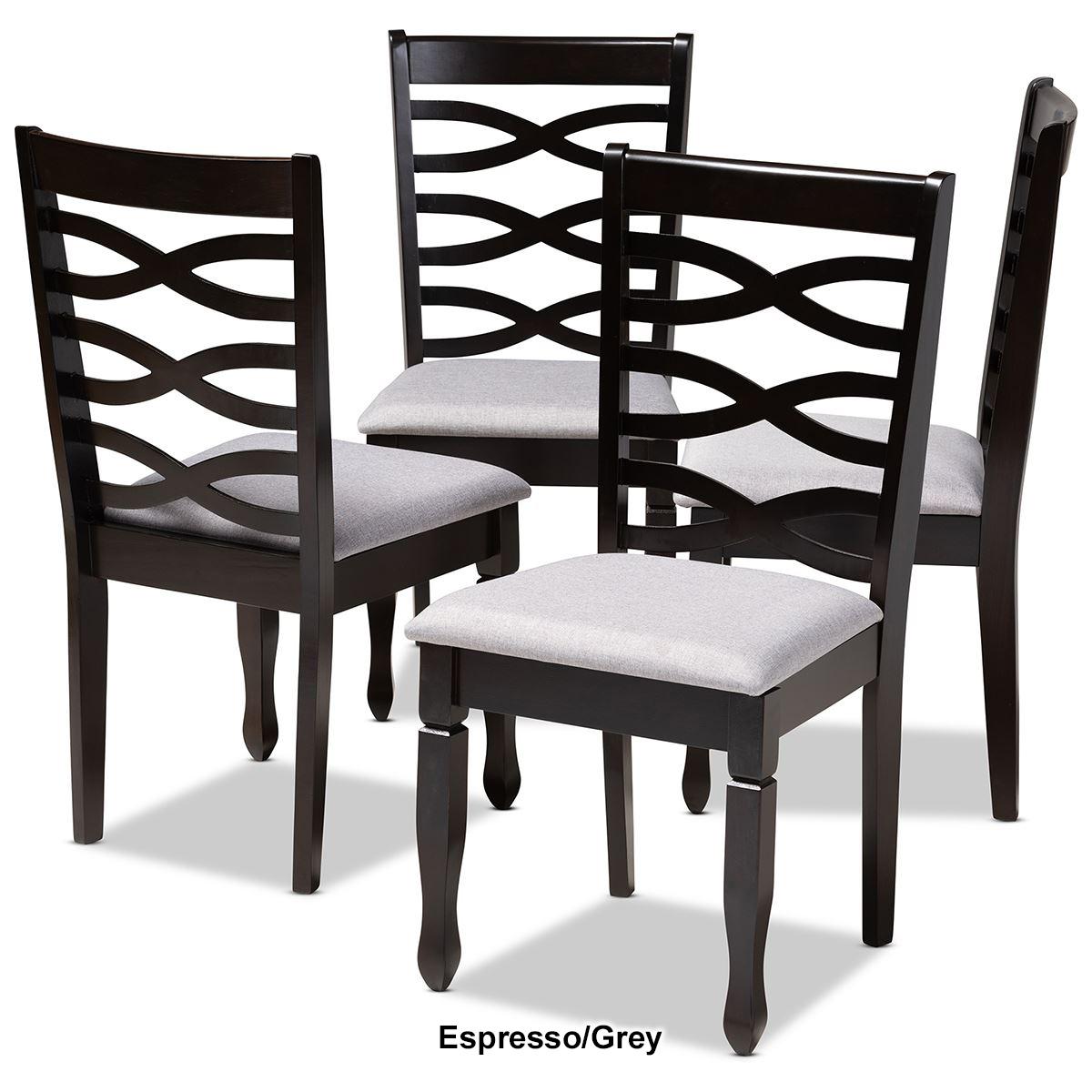 Description These Baxton Studio Lanier wood dining chairs come as a set of 4 and feature an exquisitely crafted frame and are a timeless addition to any dining space. The solid...