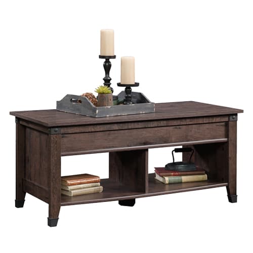 Sauder Carson Forge lift top coffee table features a hidden storage beneath the top for blankets, games, remotes and much more. Open shelves for additional storage and display of home décor. Wrought iron style accents. Finished on all sides for versatile placement anywhere in your home. Coffee Oak finish.