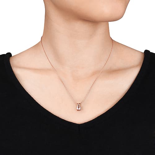 This Gemstone Classics™ morganite earrings and necklace set is a delightful set that features a pair of round-cut 1 4/5ctw. morganite earrings and necklace with a matching morganite stone in the center. This pendant dangles from a rose rhodium plated sterling silver cable chain which closes with a spring ring, while butterfly clasps secure the earrings. Chain length: 18 inches.