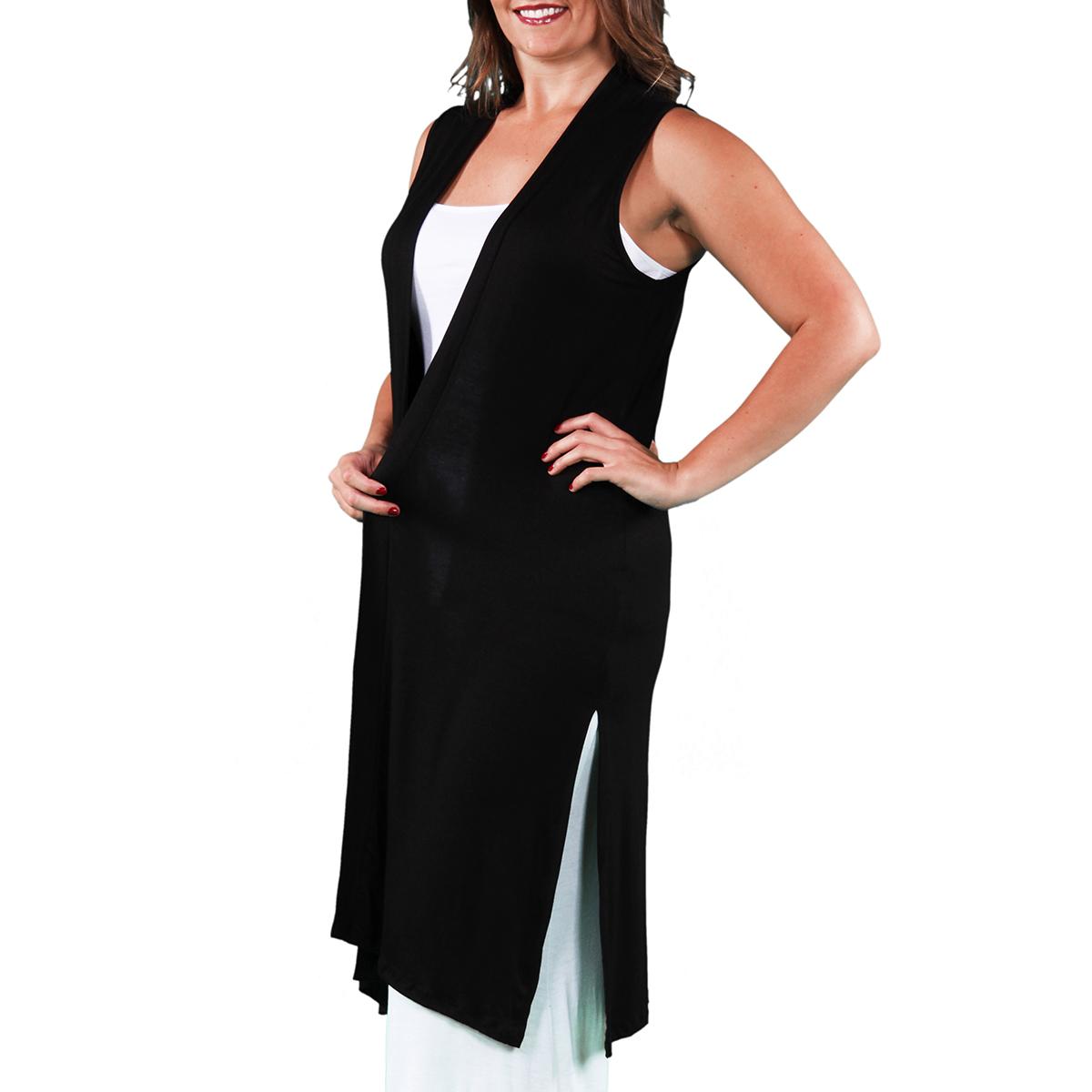 Description Pattern: SolidSleeve Length: SleevelessExtra long hemline Split side hemsLinear hemline Open front Care: Dry Flat, Machine Wash Material: Rayon, Spandex Made in USA...