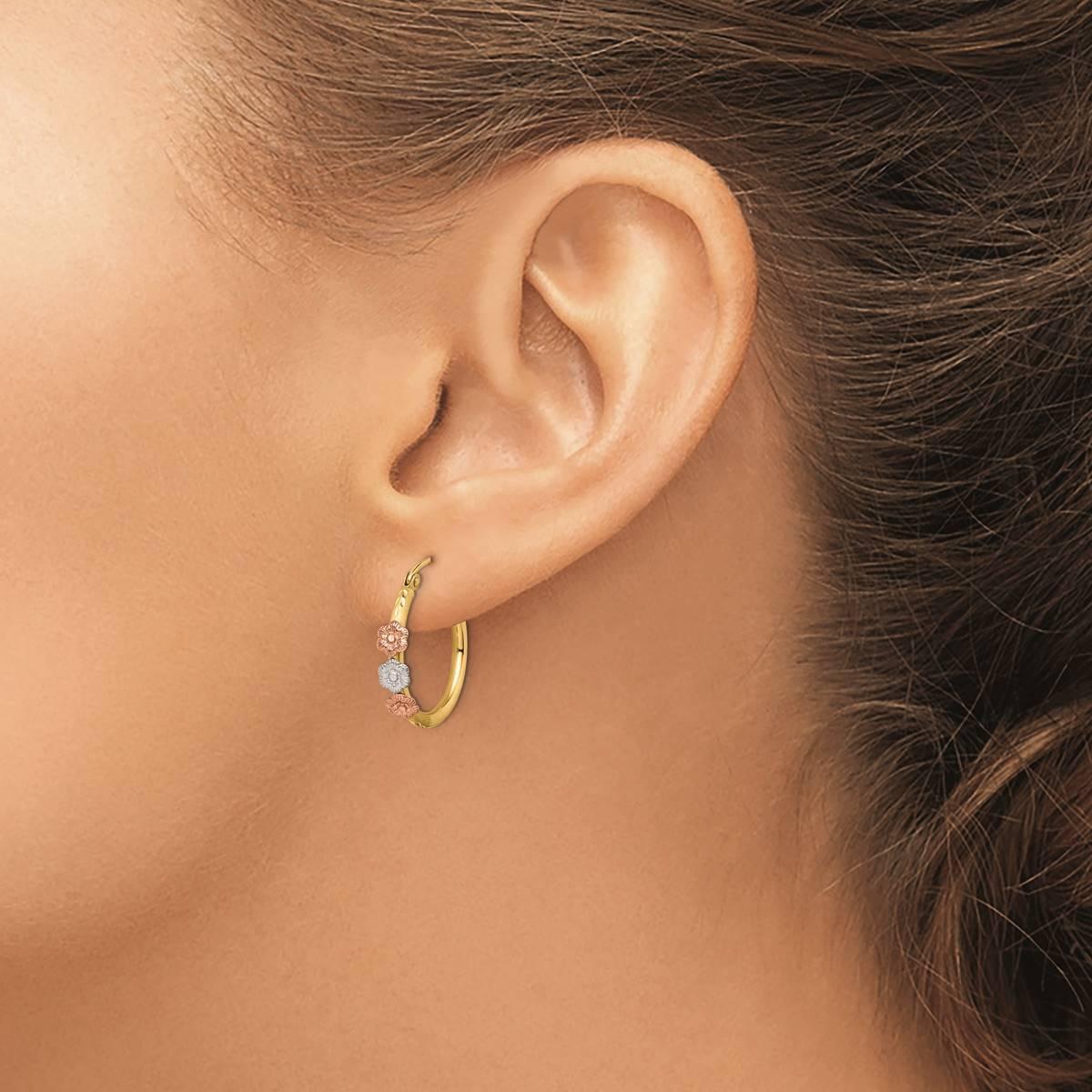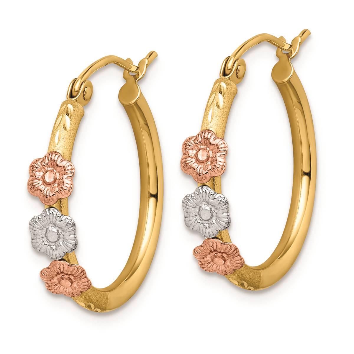 Liven up any look with these Gold Classics™ flower hoop earrings. Crafted from 14kt. tri-color gold these earrings are graced with a luxurious polished and rich satin finish to offer a mesmerizing look. These earrings are secured with wire and clutch closure for perfect hold.