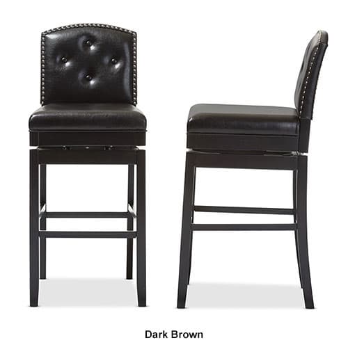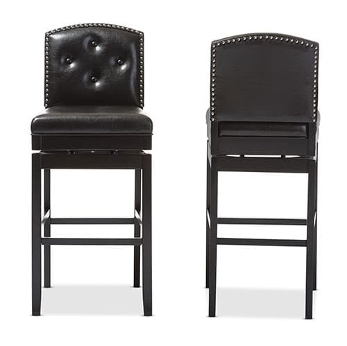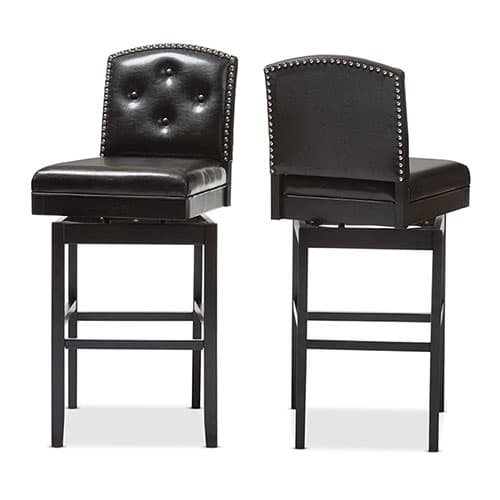 The Baxton Studio Ginaro button-tufted swivel bar stools set of 2 are an ideal choice for any modern bar or pub - providing a comfortable seat at a height! The elegant and sophisticated bar stools have a button-tufting design and features curved back with silver nail heads trim on the seat back for a contemporary look. The detailed piping around the seat cushion showcases the clean lines while the tapered legs are enhanced with wooden stretchers for durability. They are fully upholstered in faux leather with comfortable foam padding and would fit extremely well in a home bar or restaurant bar environment. Faux Leather. Rubberwood. MDF. Foam. Wipe with a damp cloth to clean, either with or without a small amount of mild soap (test first), then wipe dry. Dimensions: 43.1”H x 18.3”W x 21.7”D.