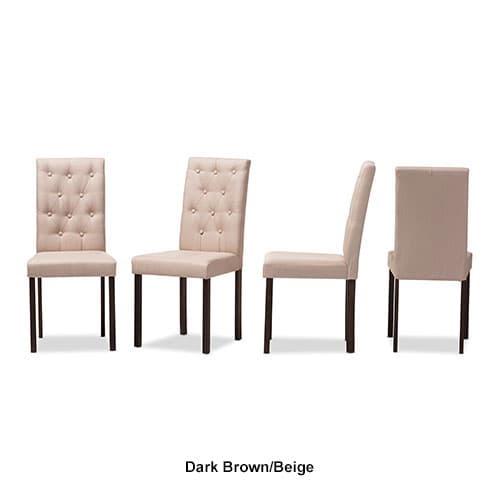 The Baxton Studio Gardner modern and contemporary upholstered dining chairs set of 4 sits perfectly around dining table for an elegant appeal throughout your dining room! They have a luxurious, deep button back with a woven polyester fabric with a classic shape that is accented by an elegant diamond tufting with matching buttons. With simple yet statement design principles, these timeless pieces will look great for years to come. 100% Polyester. Rubberwood. Foam. Spot clean only. Dimensions: 36.2”H x 17.3”W x 21.5”D.