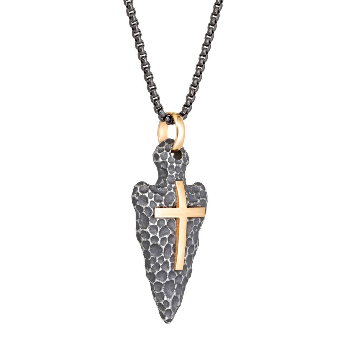 This Mens Lynx stainless steel arrow head cross chain necklace will give that lucky man in your life the perfect addition to his jewelry collection. This two-tone dog tag is crafted in gold ion-plated stainless steel with a contrasting pattern. This pendant features a 24" box chain that is secured with a lobster claw clasp.
