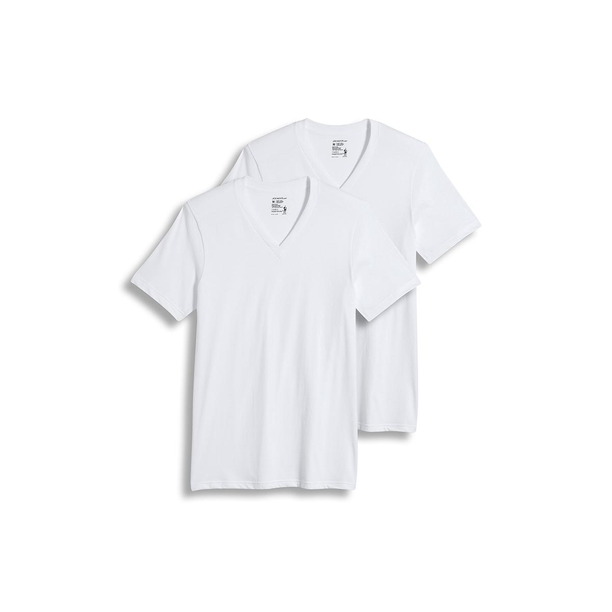 The Mens Big Jockey® 2-pack of classic v-neck t-shirts is a comfortable classic with a reinforced collar and sweat-wicking fabric. StayNew® technology reduces pilling and fading while Diamond Bright® technology helps keep whites looking whiter, wash after wash. A tag-free design helps eliminate irritation for all-day wear.