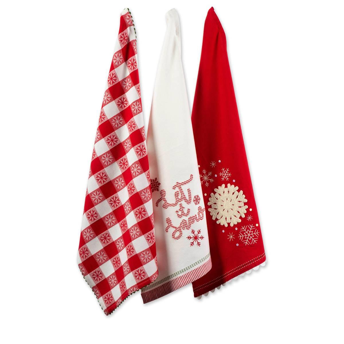 These DII® Let It Snow kitchen towels will add a little Christmas decor to your kitchen. Featuring one jacquard snowflake check with ric rack on all four edges, one candy cane stripe, and one falling snowflake with embroidery, flocking, and sequins. Each piece has a hanging loop in the corner and made of high quality tight knit material that allows for less lint on your glass or plates.