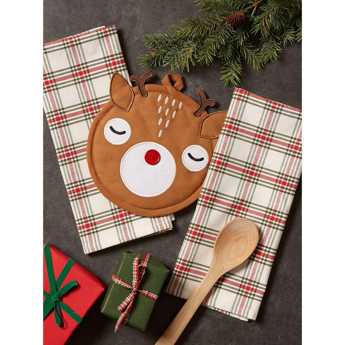 Description This DII® Rudy reindeer kitchen set will add a little Christmas decor to your kitchen. The set includes 2 kitchen towels hemmed with a hanging loop in the corner and...