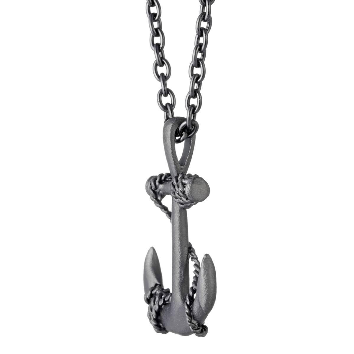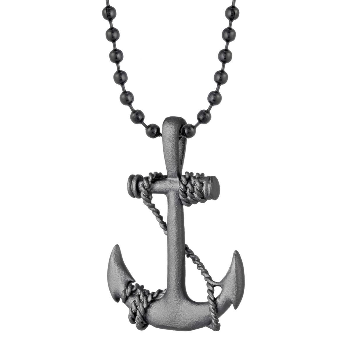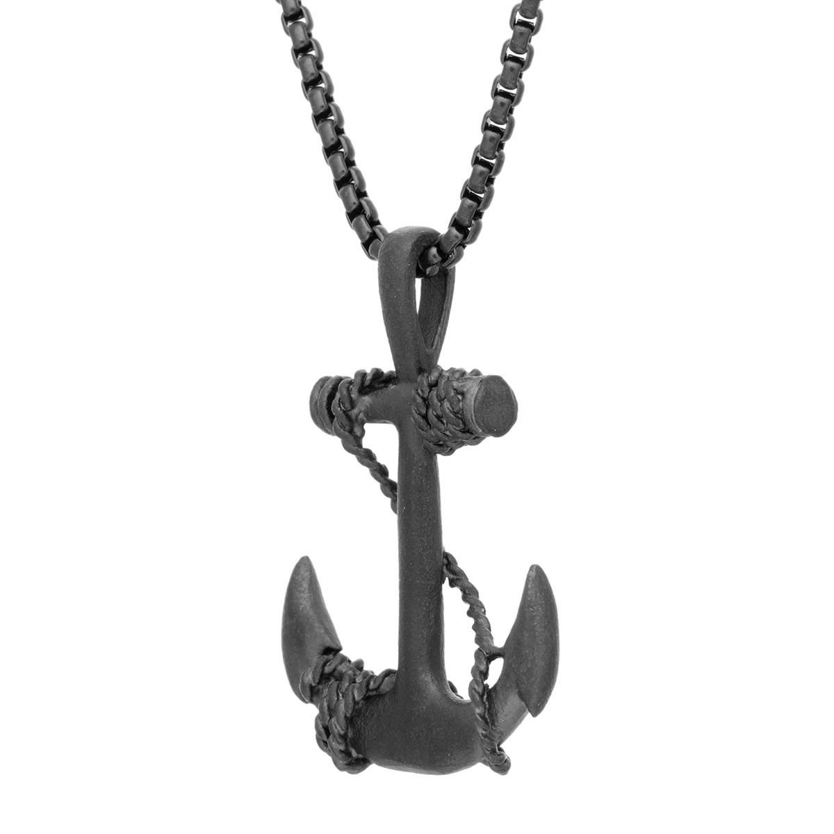 This Mens Lynx stainless steel anchor pendant features a detailed anchor with a winding rope design crafted in matte finish black ion-plated stainless steel. This pendant is complete with a 24" round box chain that is secured with a lobster claw clasp.