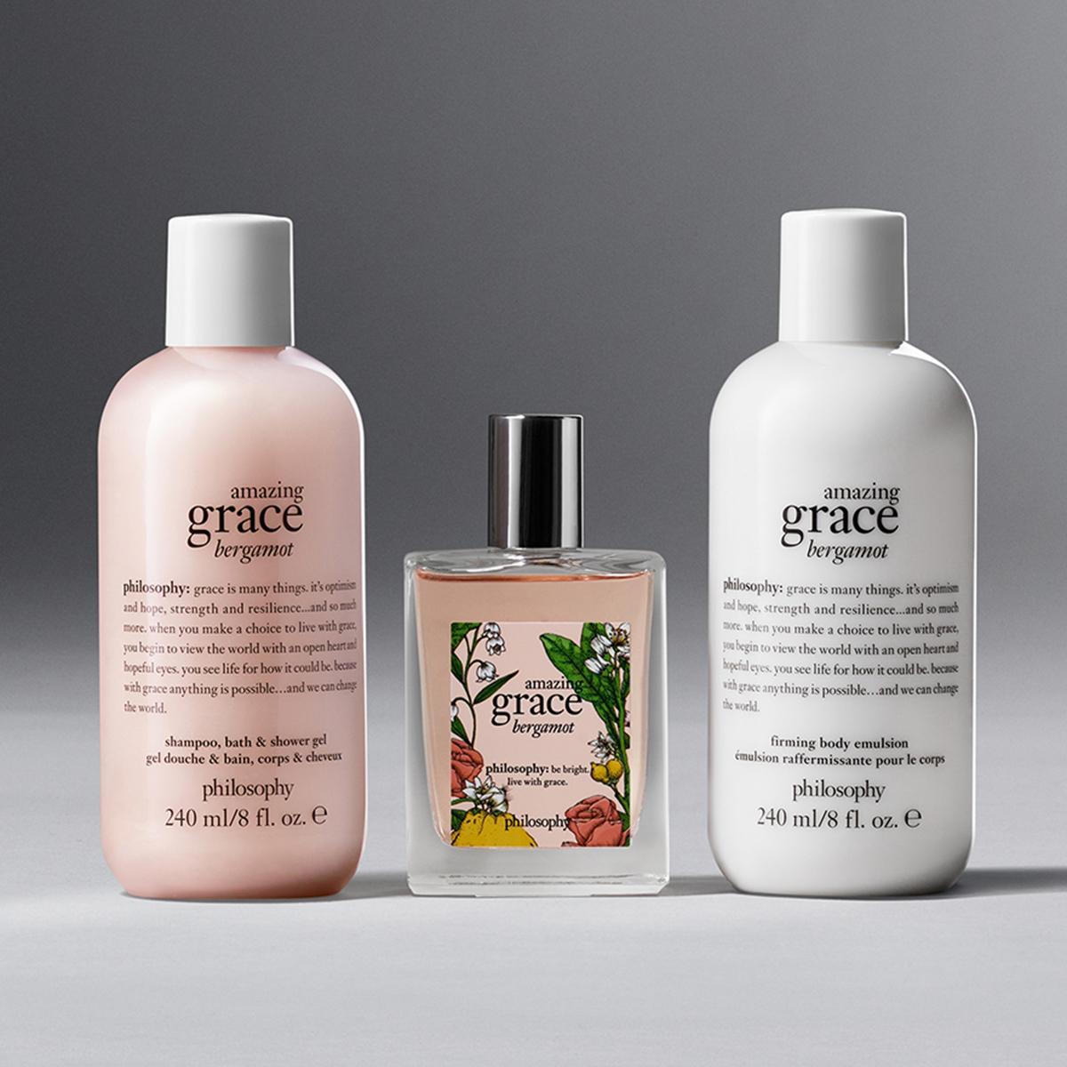 experience the brighter side of grace. a limited edition twist on the iconic whisper-soft floral, amazing grace, sheds new light on the beloved scent.luscious bergamot amplifies the timeless softness of the original favorite. delicate floral orange blossom mingles with muguet to mellow the composition, coming to rest atop graceful warm musk.