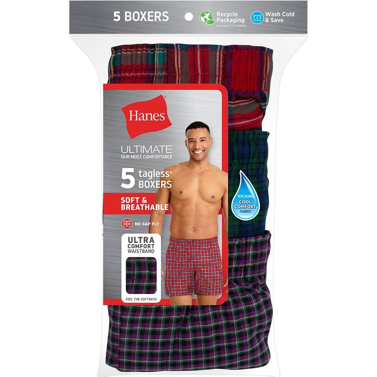 Elevate your everyday essentials with this Mens Hanes Ultimate® 5-pack of tartan boxers. The boxers feature a soft and breathable fabric, an ultra comfort waistband, no gap fly, and a full cut for great all-day comfort.