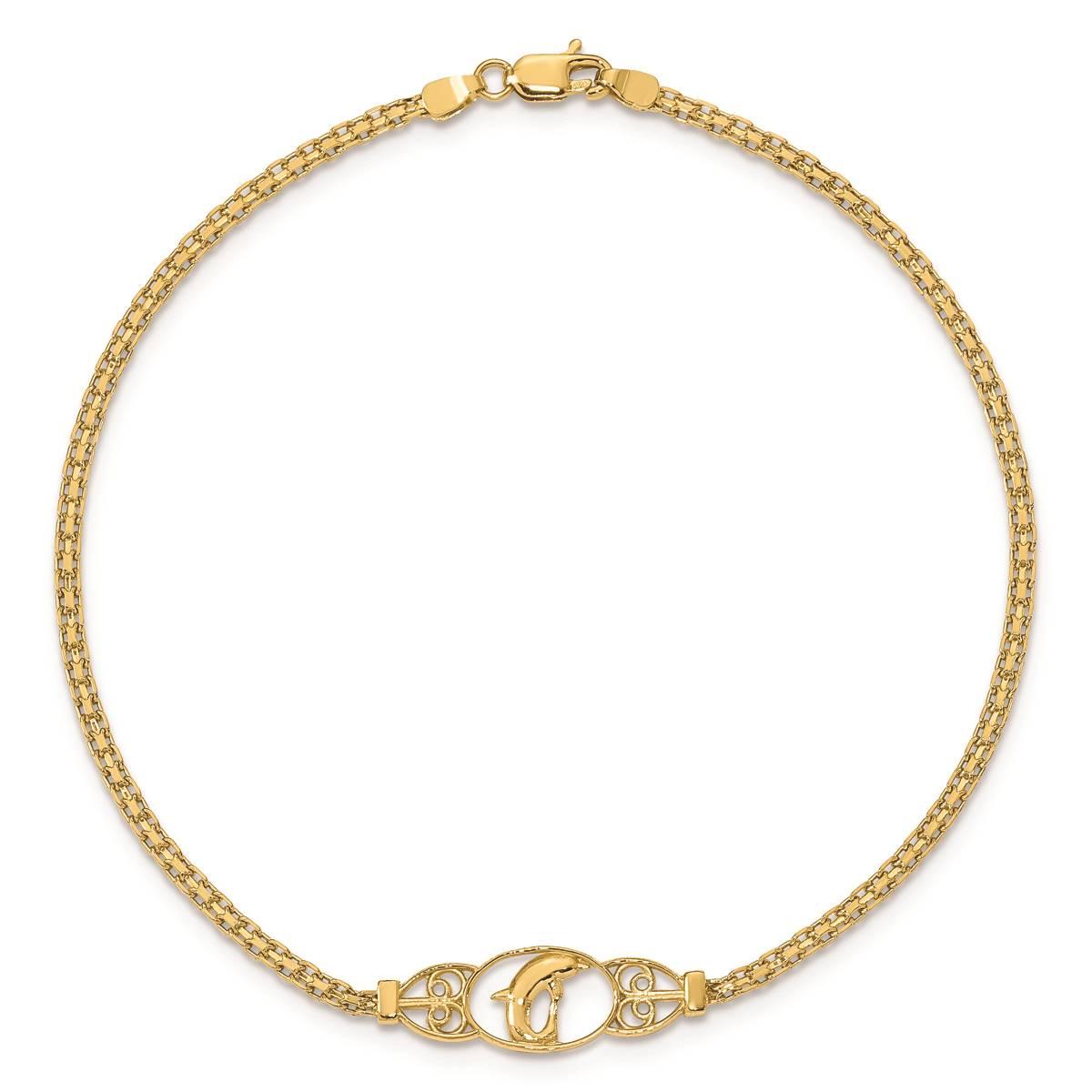 The 14kt. gold anklet features a polished dolphin design. This jewelry will dazzle any ankle and can be worn for a casual look or can be added to other pieces to dress up any outfit.