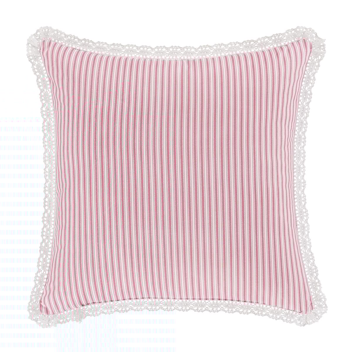 The Royal Court Rosemary 16 inch square decorative pillow showcases a classic floral design creating an atmosphere of vintage elegance. The printed white and pink floral is just lovely and is surrounded by delicate lace. It reverses to a printed ticking stripe giving versatility to this charming design.