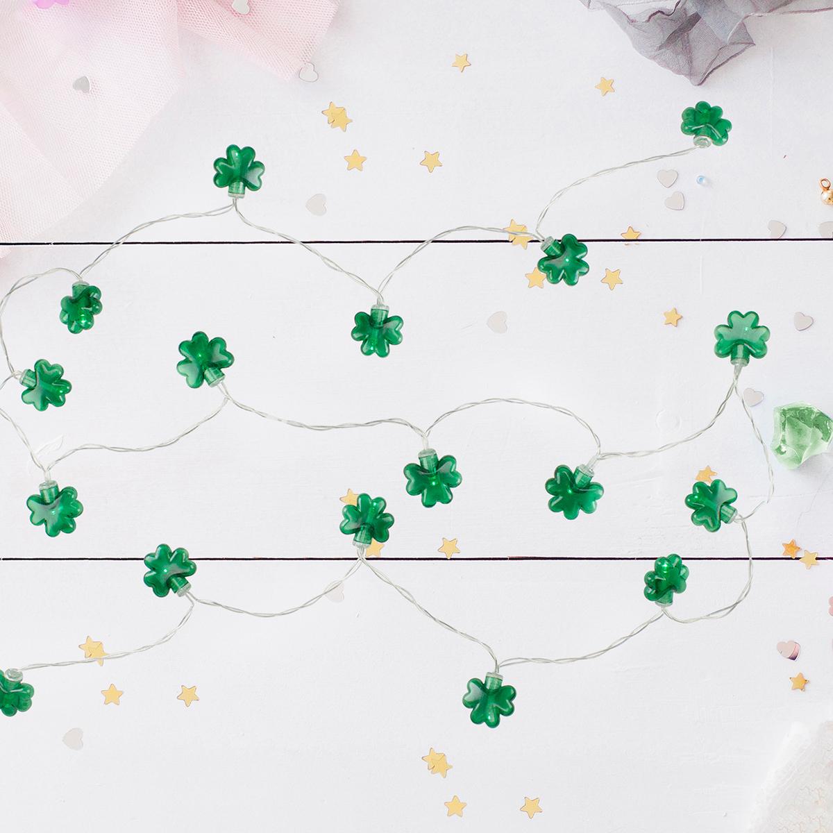 Spread a little luck of the Irish with these novelty shamrock string lights! They feature 20 mini green shamrocks on a clear wire with a battery pack. The automatic timer function allows for 6 hours on and 18 hours off. This product features green bulbs, clear wire, and green shamrock shaped light covers. The string lights come with 20 concave wide angle LED bulbs that use 90% less energy and cool to the touch. There is 3.5" spacing between each bulb with a lighted length of 5.5´ and a total length of 6.3´ on a 10" lead cord.Additional product features include an automatic timer function with 6 hours on and 18 hours off, non-replaceable bulbs, on/off switch located on the back of the battery pack.WARNING: This product may expose you to chemicals such as lead and lead compounds, which are known to the State of California to cause cancer and birth defects or other reproductive harm. For more information go to www.P65Warnings.ca.gov.