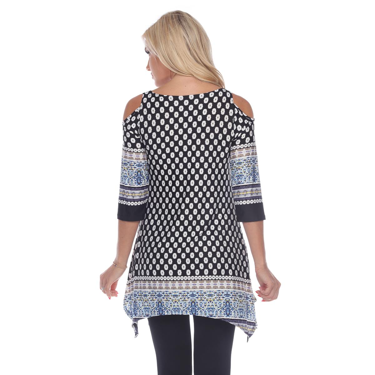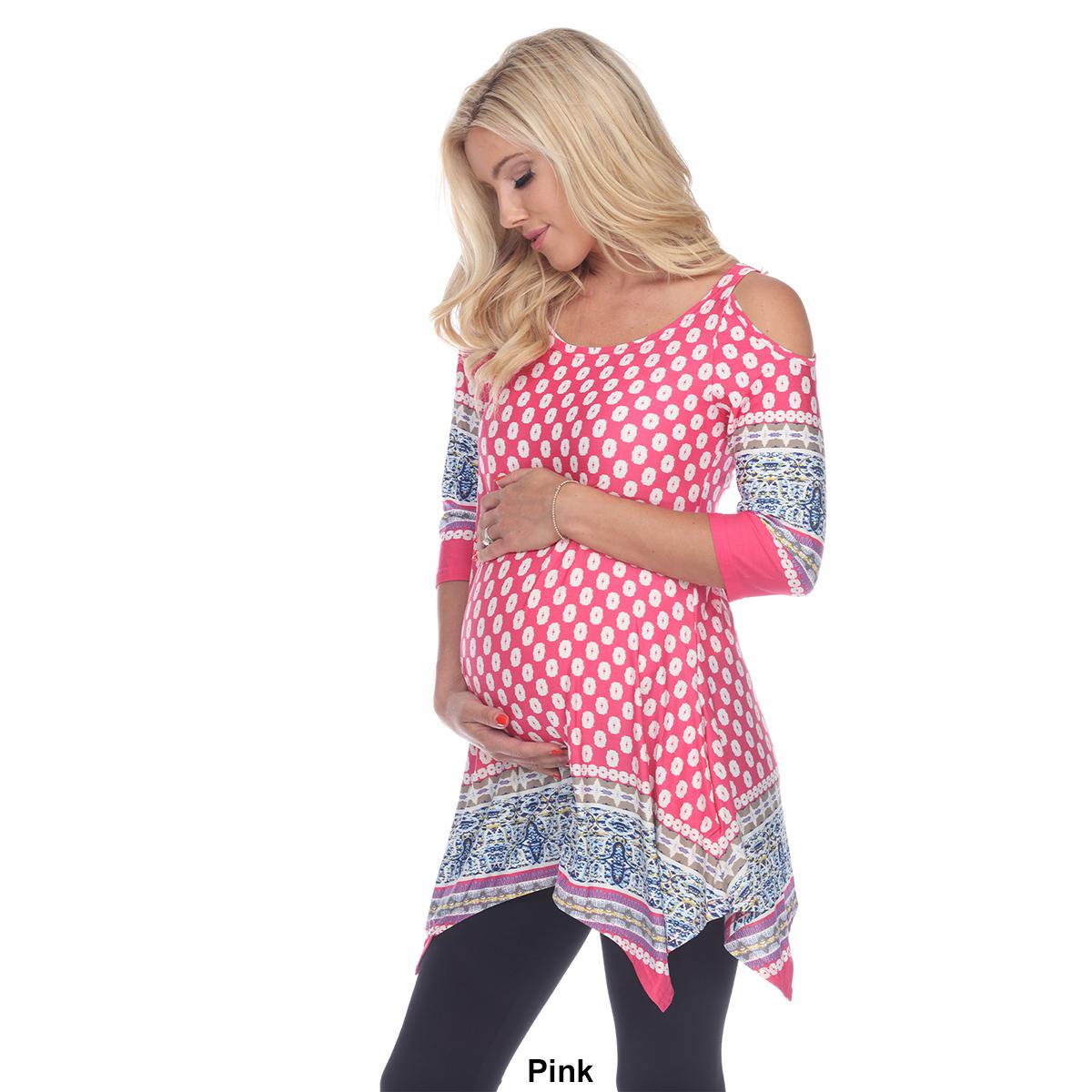 Bring vibrant energy into your wardrobe with this Womens White Mark tunic maternity top. This dot and novelty print top includes 3/4 length sleeves, a scoop neckline, and a cold shoulder detail.