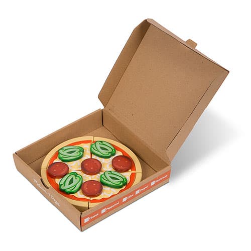 With the Melissa & Doug® Top & Bake Pizza Counter you can create fresh-baked pizza, made to order, with this deliciously unique 34 piece pizza making set. Start with felt sauce and cheese on the wooden crust, choose from wooden toppings (pepperoni, olives, mushrooms, and peppers), then “bake” in the pizza oven built in to the storage and serving counter. The pieces stick together with self-stick tabs and can be sliced with the rolling wooden cutter. This set comes with a grated cheese shaker, a wooden paddle, pizza box, a reusable menu for placing orders, a guide to help with pizza prep, and play money to pay for your order. Dimensions: 13”H x 8.7”W x 7.7”D.