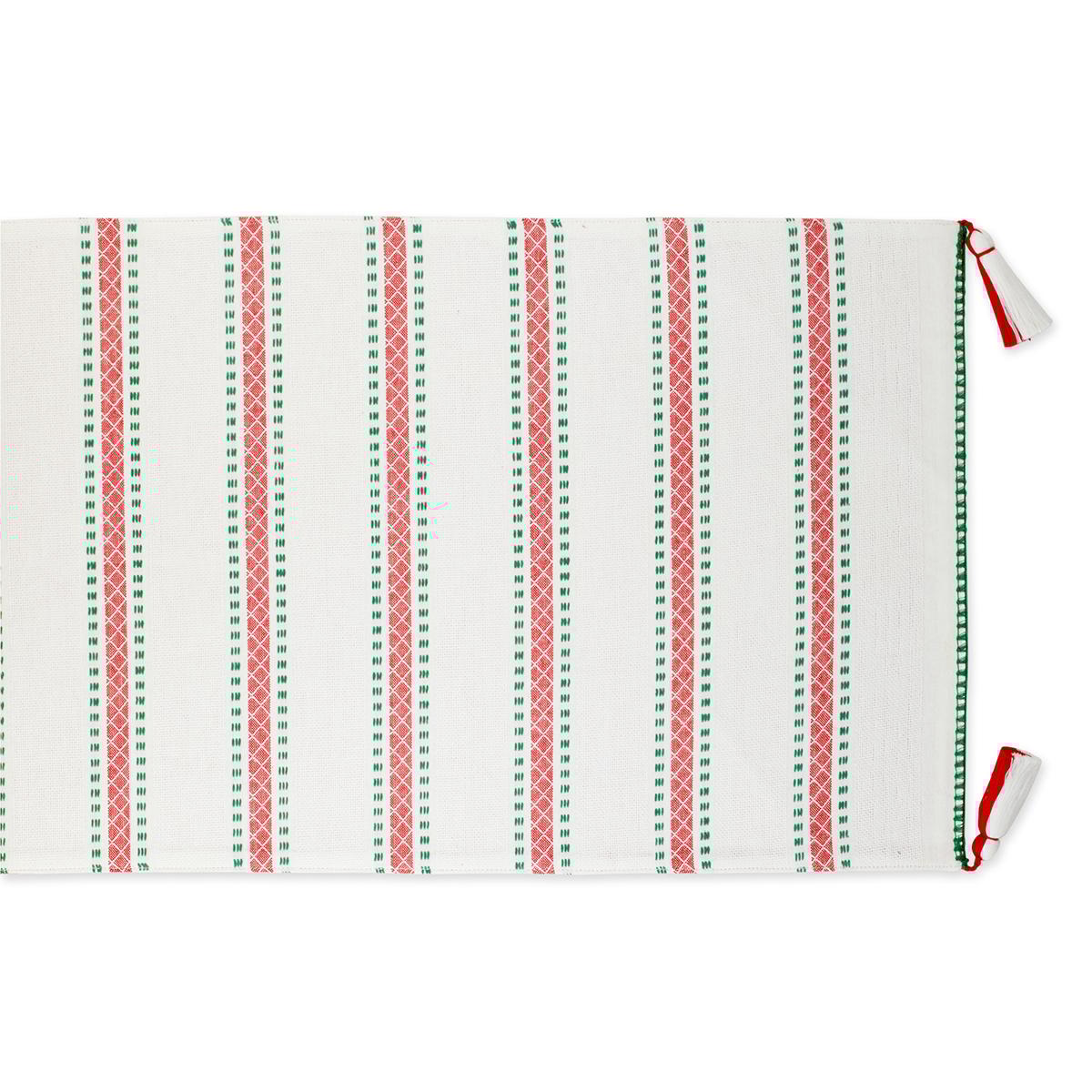 The DII® Joyful Snowflakes Reversible Jacquard Table Runner features a beautiful red and white jacquard snowflake design on one side and a holiday cozy sweater stripe on the reverse side. Each end is finished with shell stitching and red and white tassels in each corner.