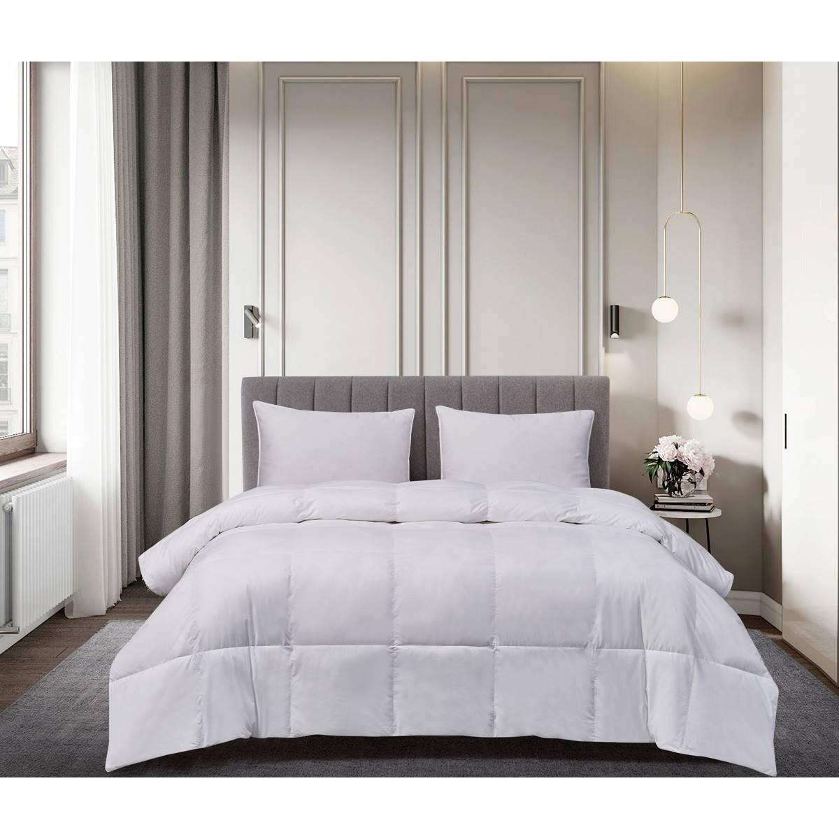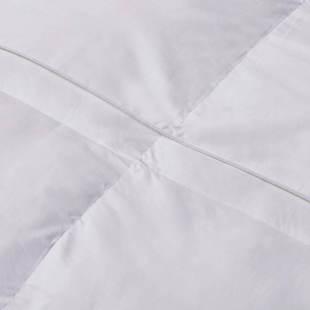 Description Sleep in pure luxury with this 240 thread count down and feather comforter. 25% Hypoallergenic White Goose Down, 75% White Goose Feathers500 fill powerSewn through...