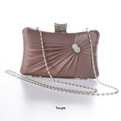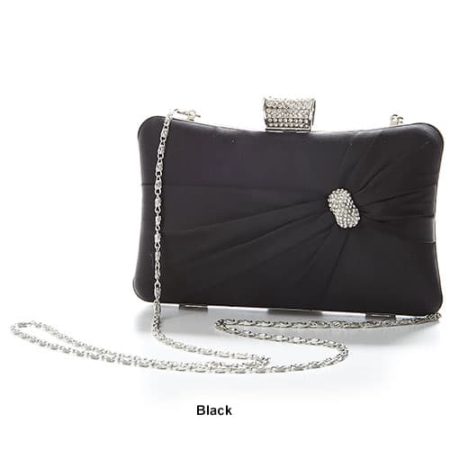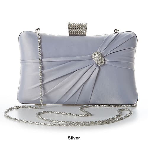 Sasha Jeweled Satin Evening Clutch. This elegant evening bag has a jewel push clasp closure. Other features include a detachable silver-tone chain strap with a 24" drop, a detachable rope strap, pleats and rhinestone details on the front. Dimensions: L 7.5" x W 1" x H 4 ".