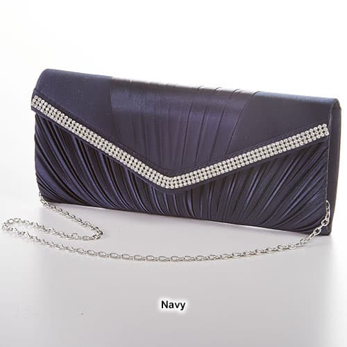 Description Sasha Evening Clutch. Magnetic snap closure, detachable chain strap with 12" drop. The exterior features silver tone hardware, rhinestones, and ruched detail on the...