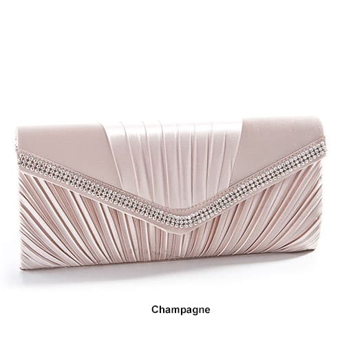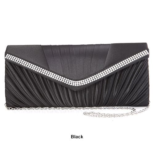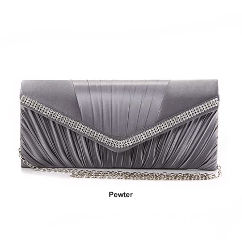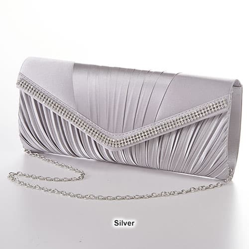 Sasha Evening Clutch. Magnetic snap closure, detachable chain strap with 12" drop. The exterior features silver tone hardware, rhinestones, and ruched detail on the front. A detachable rope strap is included.