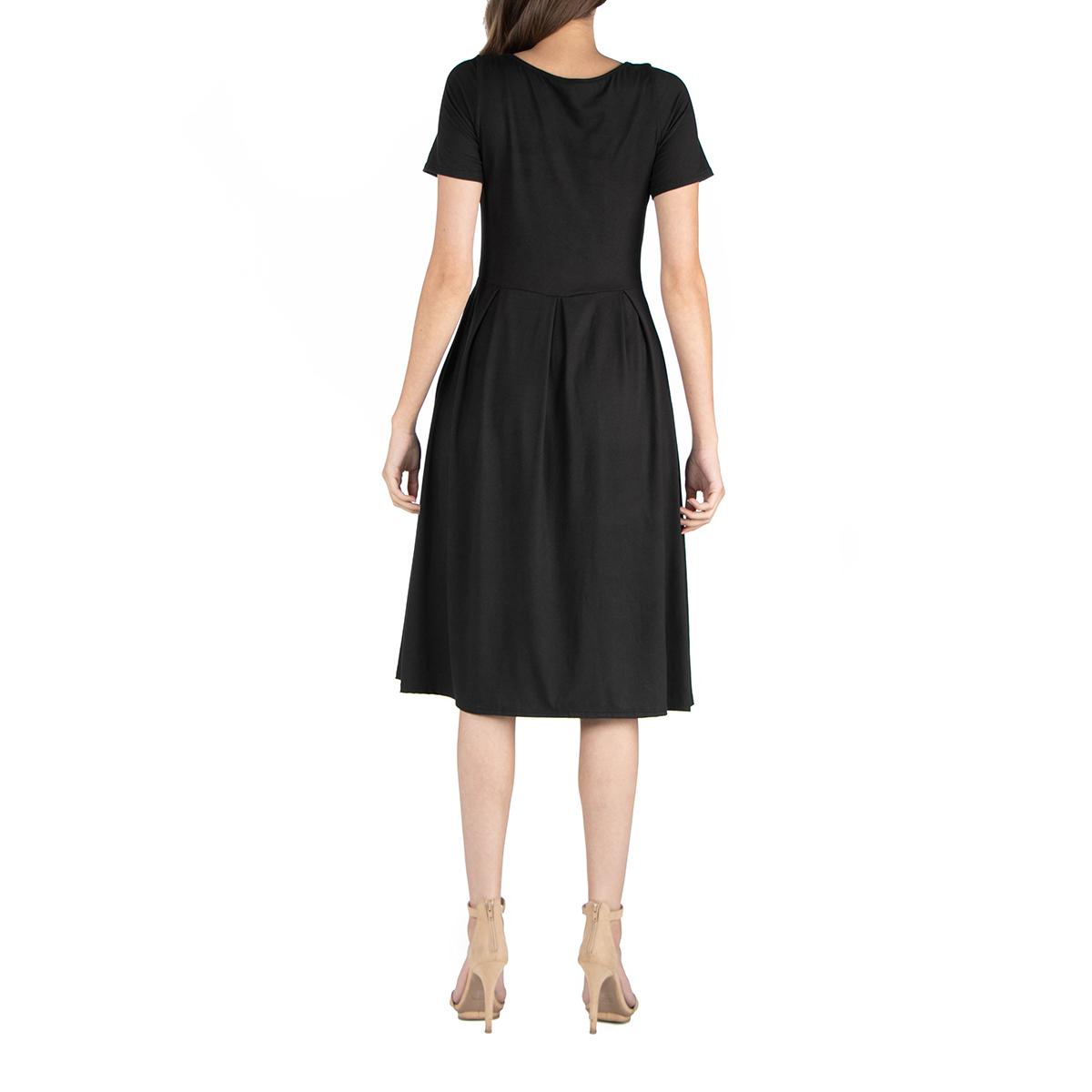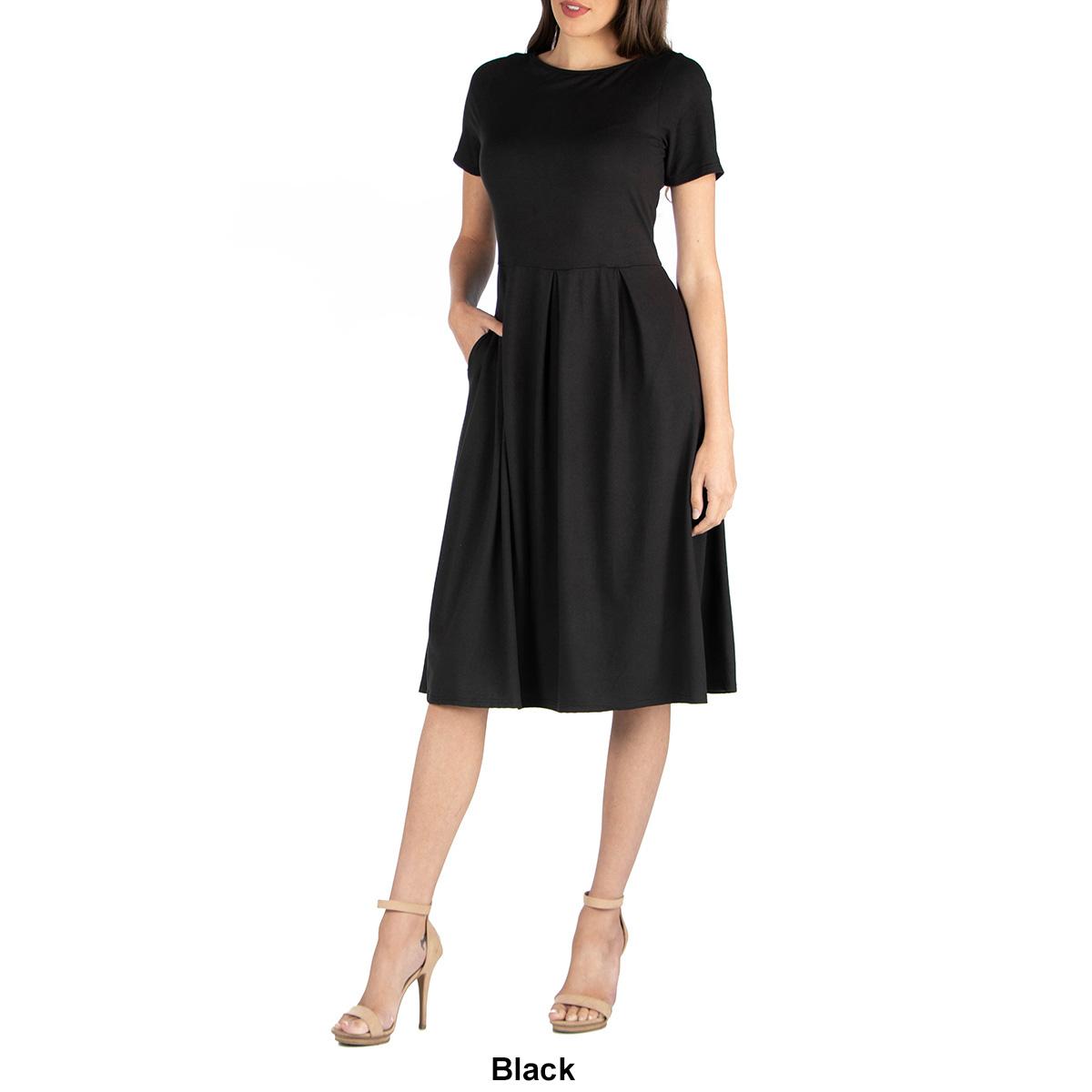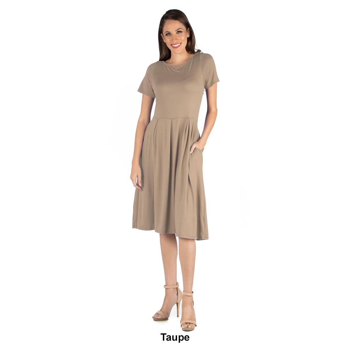Simple yet elegant and refined, this Womens 24/7 Comfort Apparel midi dress features a slim fit waistline and soft flare hemline that will complement any figure. This short sleeve dress with a round neckline is a staple piece for any season and the solid color will let you create your own style with jewelry or a jacket.