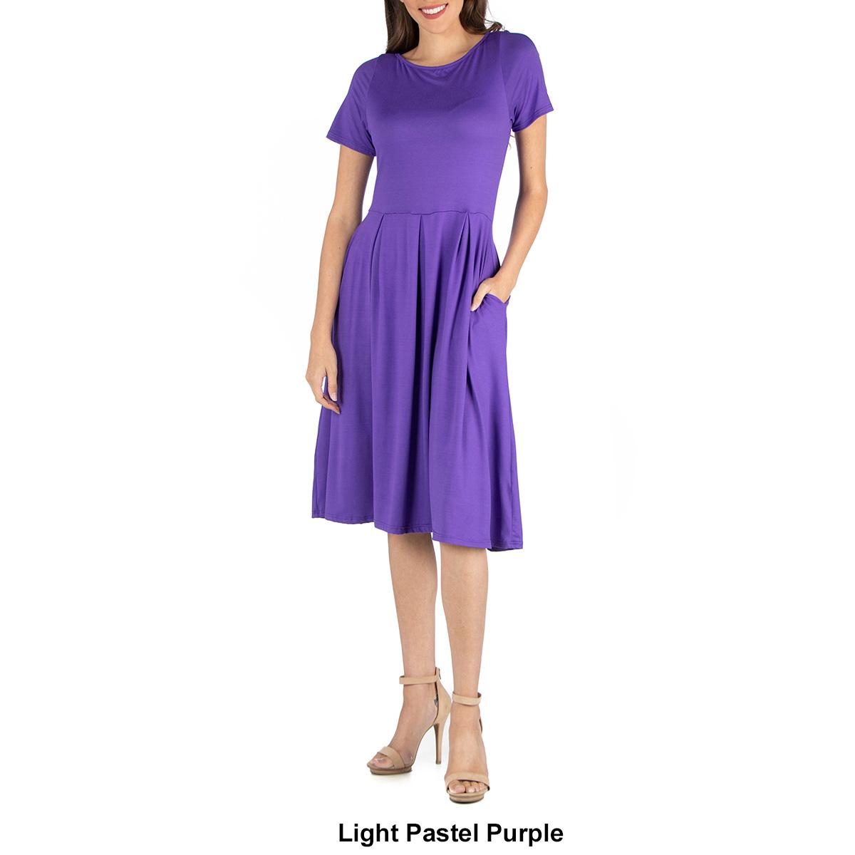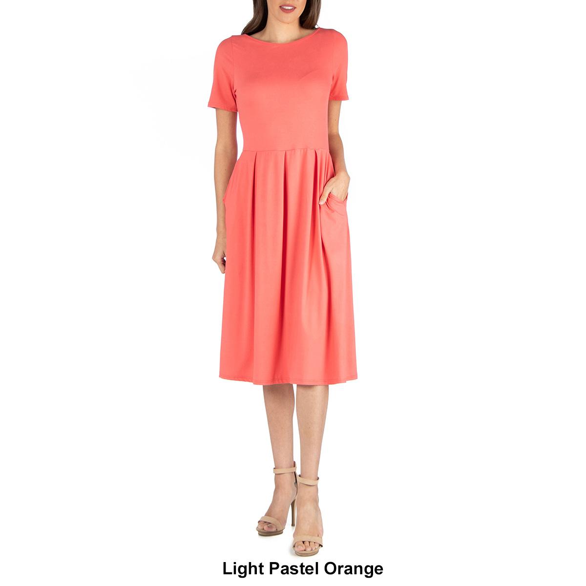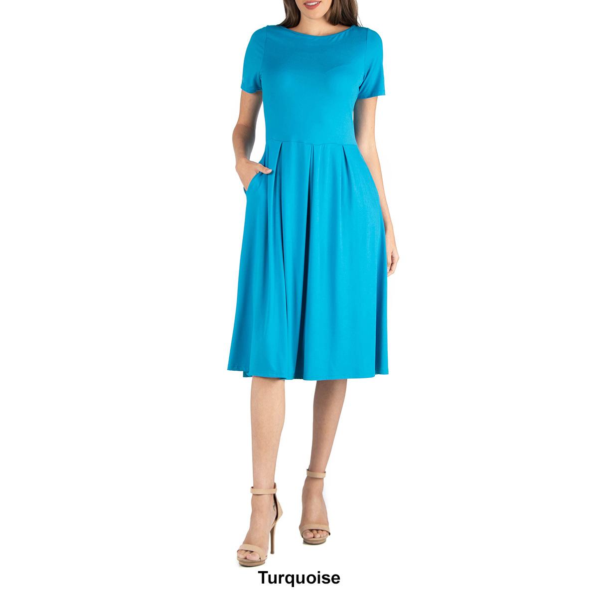 Simple yet elegant and refined, this Womens 24/7 Comfort Apparel midi dress features a slim fit waistline and soft flare hemline that will complement any figure. This short sleeve dress with a round neckline is a staple piece for any season and the solid color will let you create your own style with jewelry or a jacket.