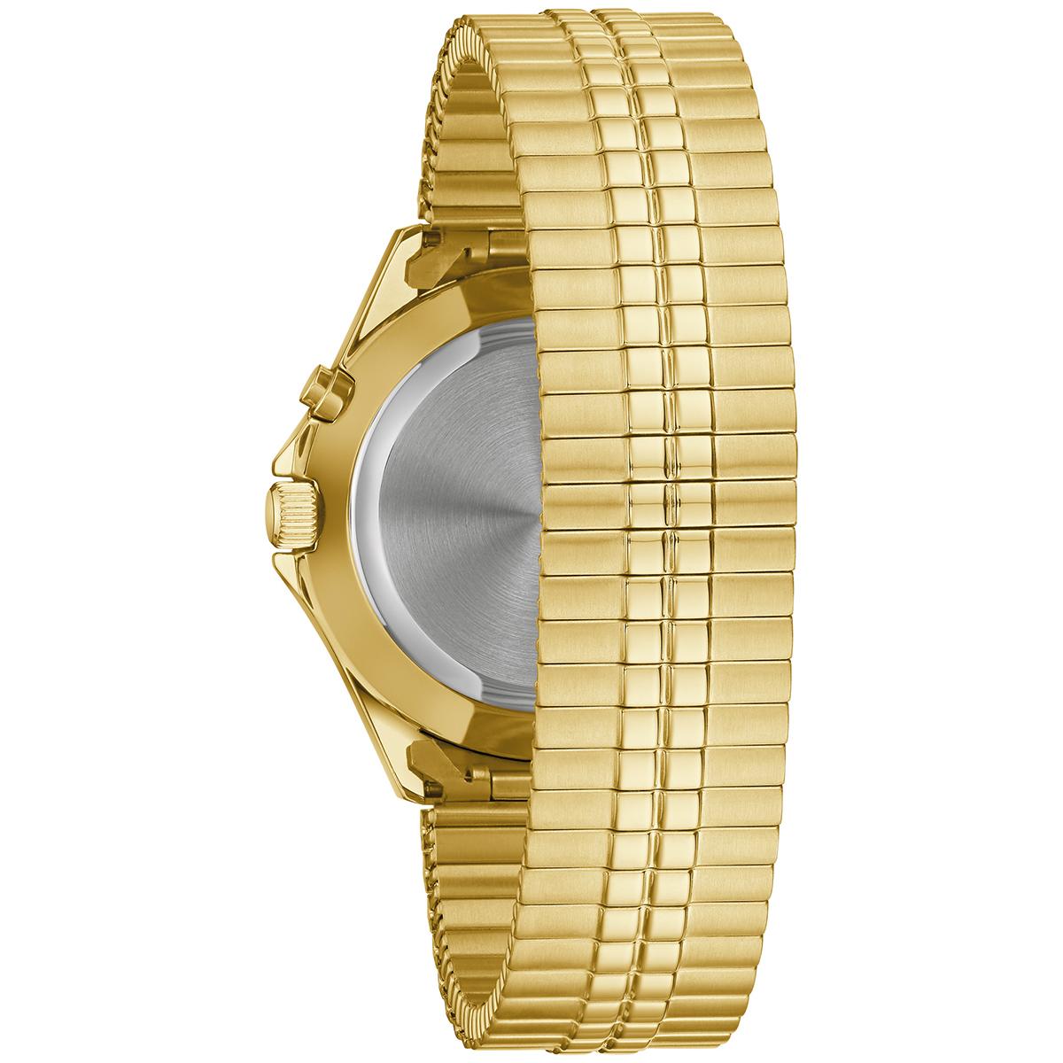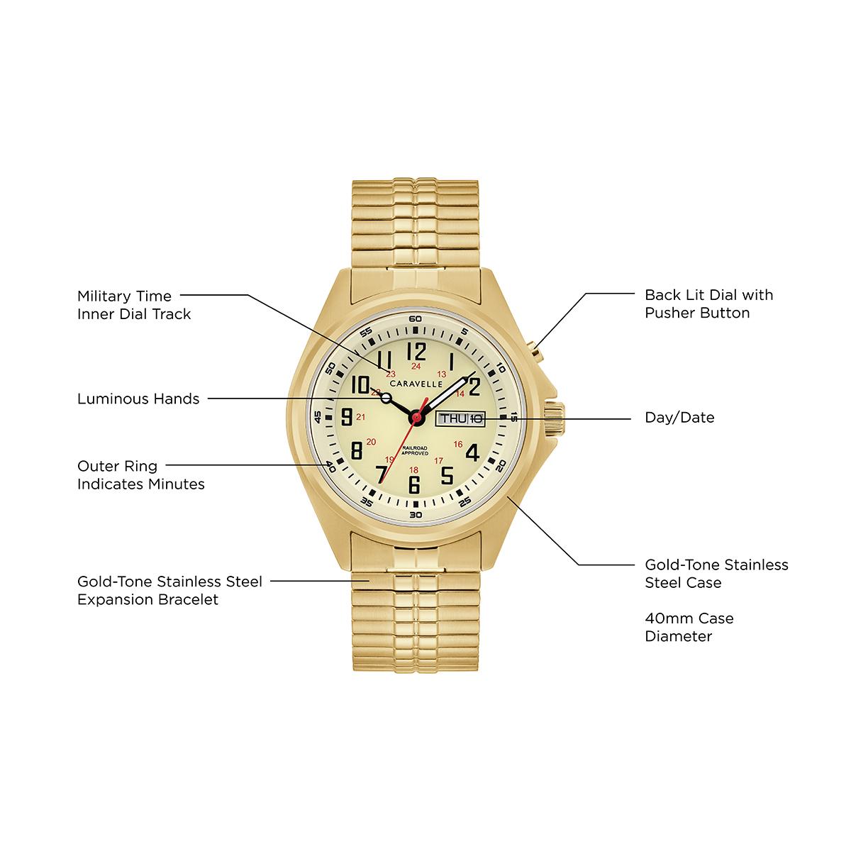 Description Simple, classic, easy to read gets even easier to read…in the dark. The Mens Caravelle gold-tone stainless luminescent dial expansion watch has a backlit feature...
