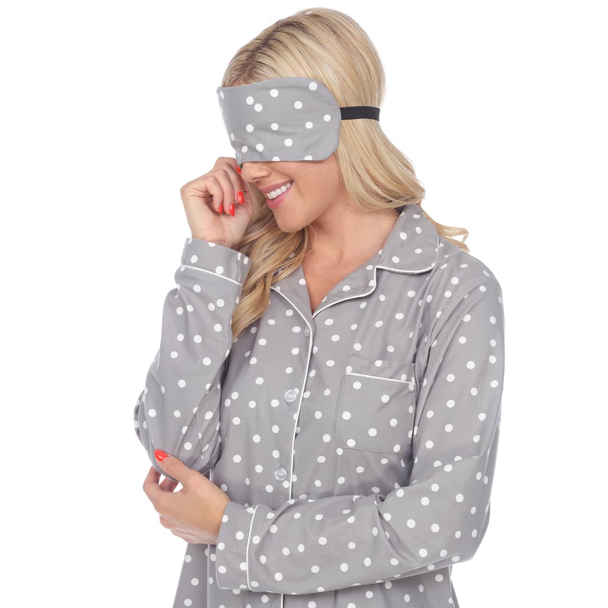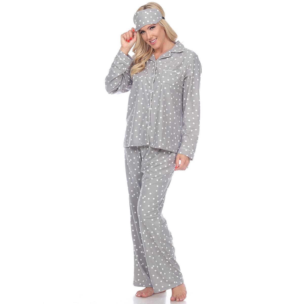 This Womens White Mark three piece dotted pajama set is very comfortable to touch and wear. The three-piece sleep set with long sleeve, button down top, long leg, and matching eye mask is made of breathable fabric for comfortable sleeping.