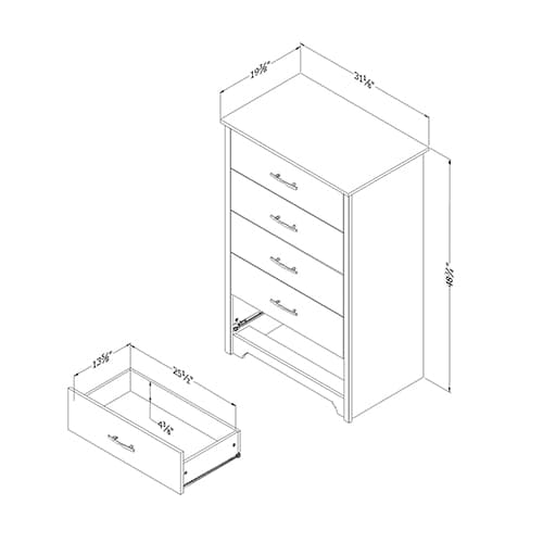 This South Shore Fusion 5 drawer chest will help you create a trendy and peaceful bedroom. Its rich grey oak finish goes perfectly with the sleek, contemporary appearance of this piece, creating something original that will give your décor a superb effect. The metal handles have a blackened brushed silver finish. Made with laminated Particleboard and Metal. Wipe with a soft dry cloth to clean. Dimensions: 48.75”H x 31.25”W x 19.5”D.