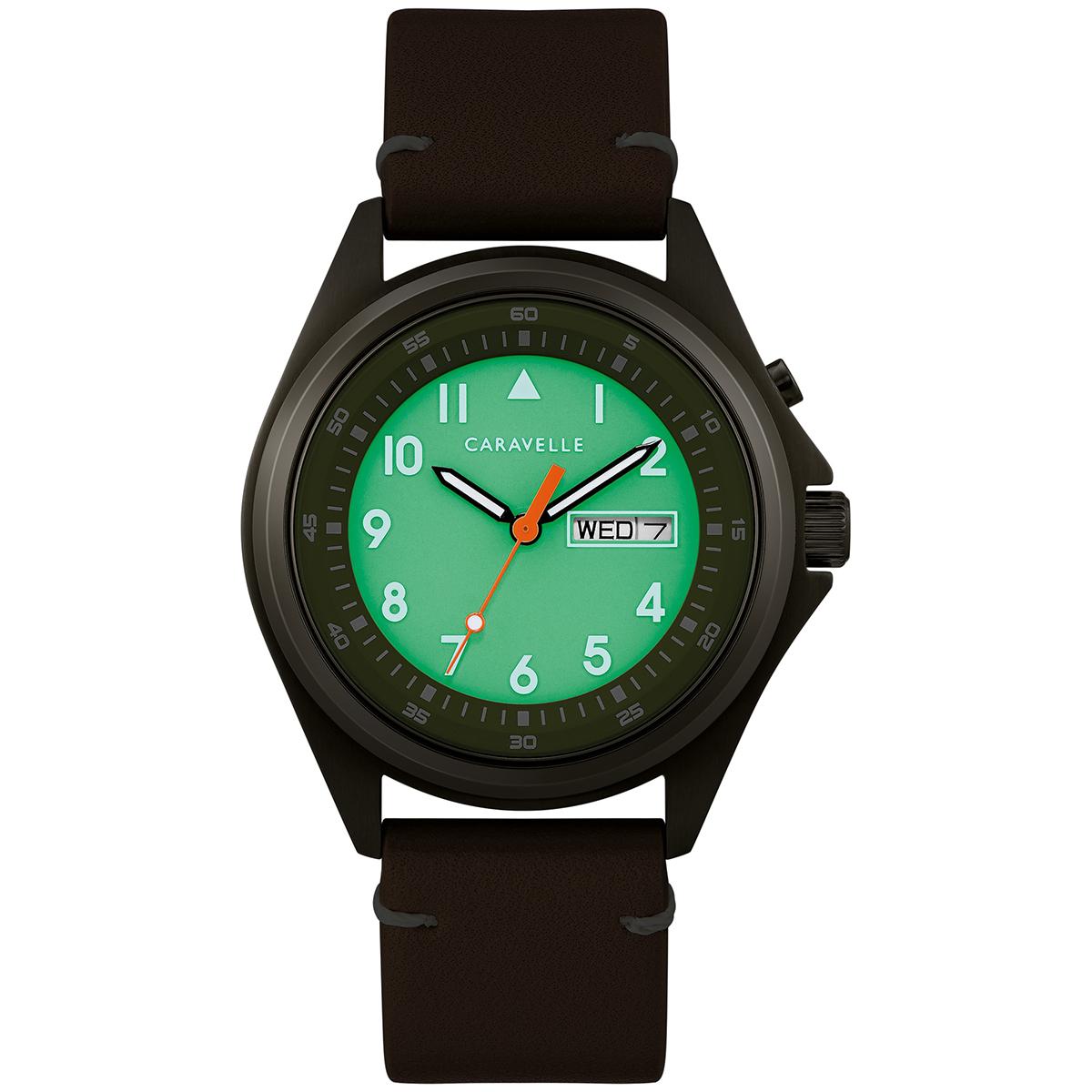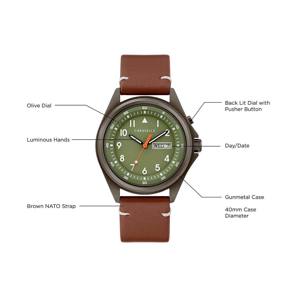 The Mens Caravelle Gunmetal IP stainless olive dial brown leather strap watch has a clean, contemporary everyday style. This watch has a gunmetal stainless steel case with an olive green dial that has a backlit feature that illuminates the dial and is activated with a pusher at 2 o’clock. The watch also features a day/date window, luminous hands, a contrast second hand, water resistance to 30 meters, and a brown leather strap with contrast stitching.