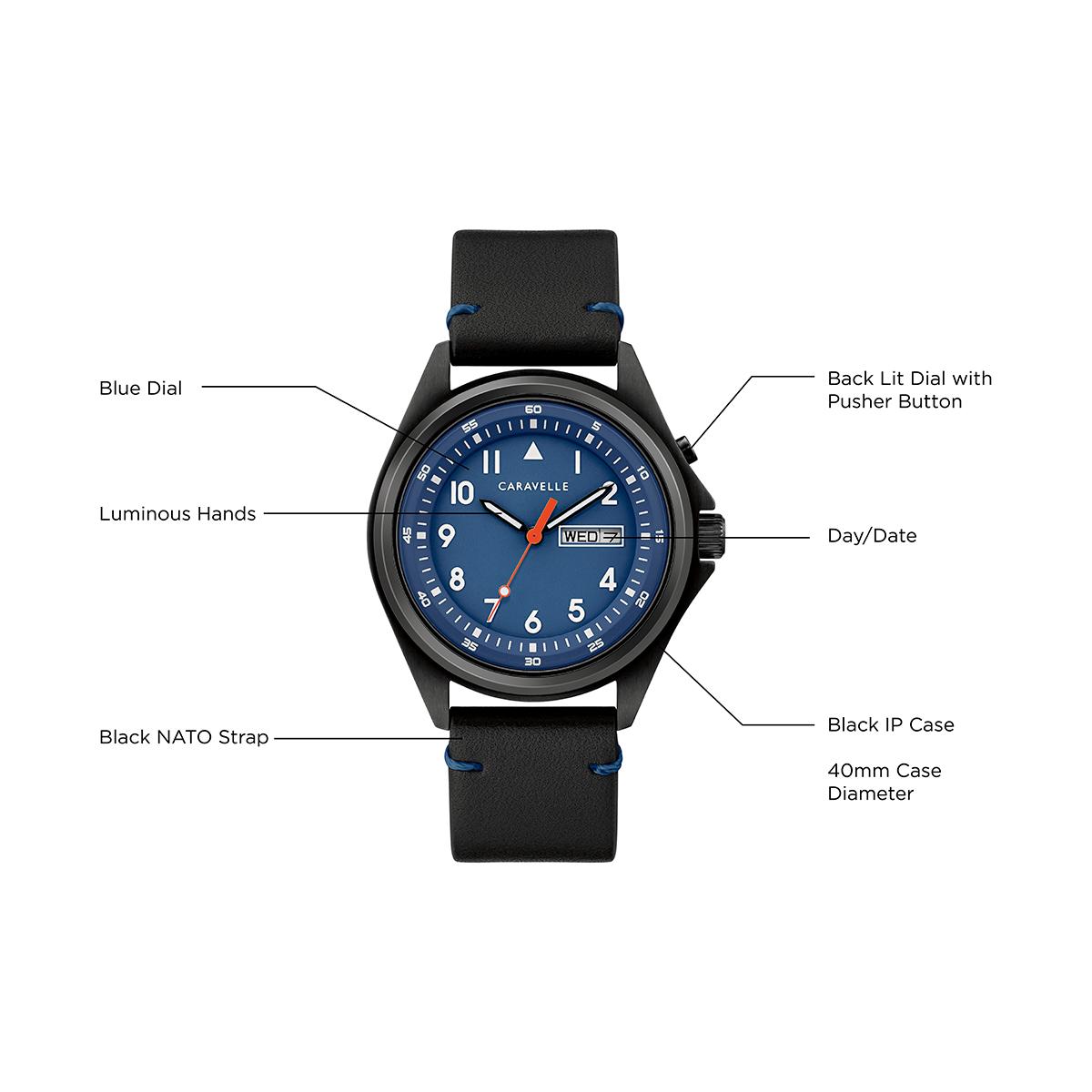 The Mens Caravelle Black IP stainless blue dial black leather strap watch has a clean, contemporary everyday style. This watch has a black IP stainless steel case with a blue dial that has a backlit feature that illuminates the dial and is activated with a pusher at 2 o’clock. The watch also features a day/date window, luminous hands, a contrast second hand, water resistance to 30 meters, and a black leather strap with contrast stitching.